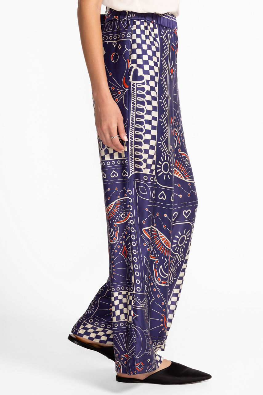 Crafted from a billowing silk blend, the Keoki Wide Leg Pants are embellished with a bold patchwork pattern. Designed with an elastic waist and a wide-leg cut, these unique pants have a retro-inspired feel. Pair with the Keoki Oversized Shirt and bold ankle boots for a modern, fashionable look.