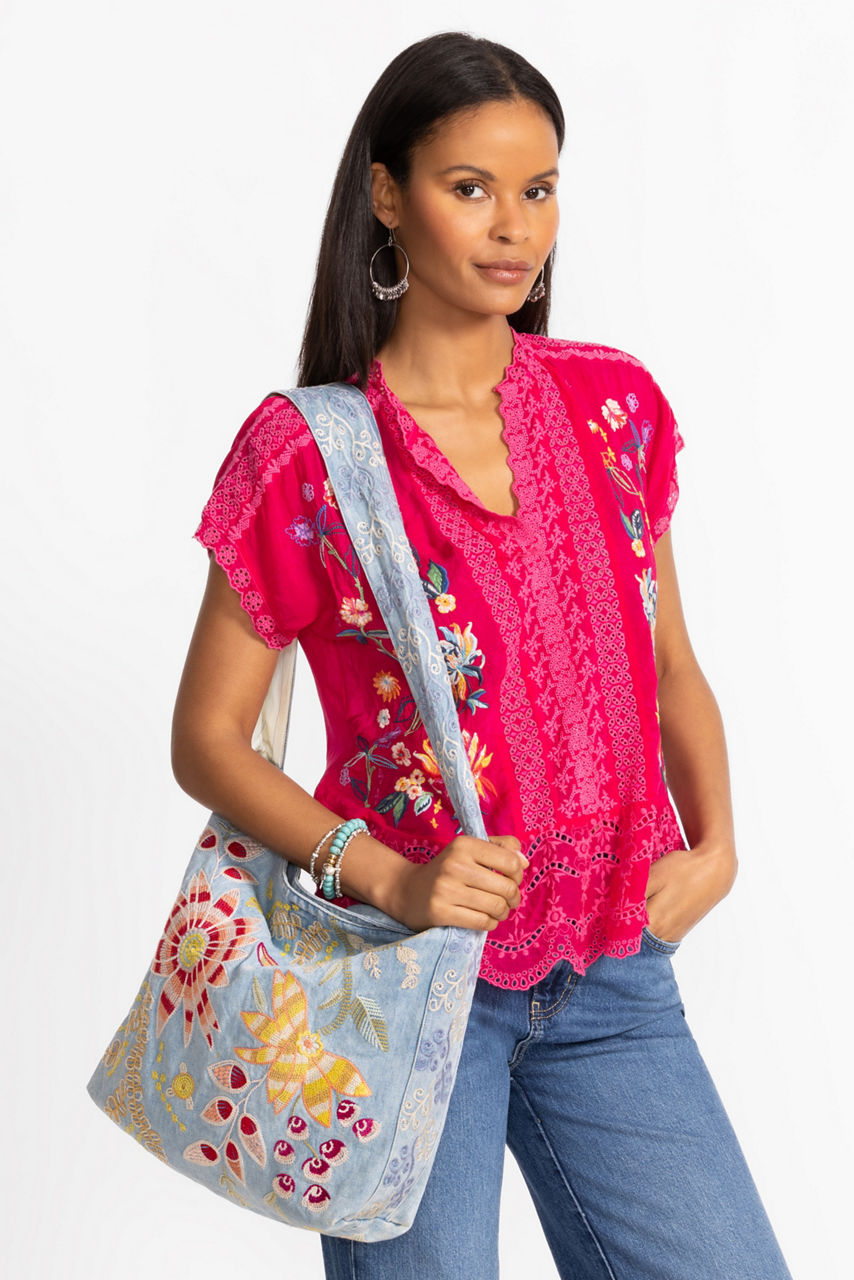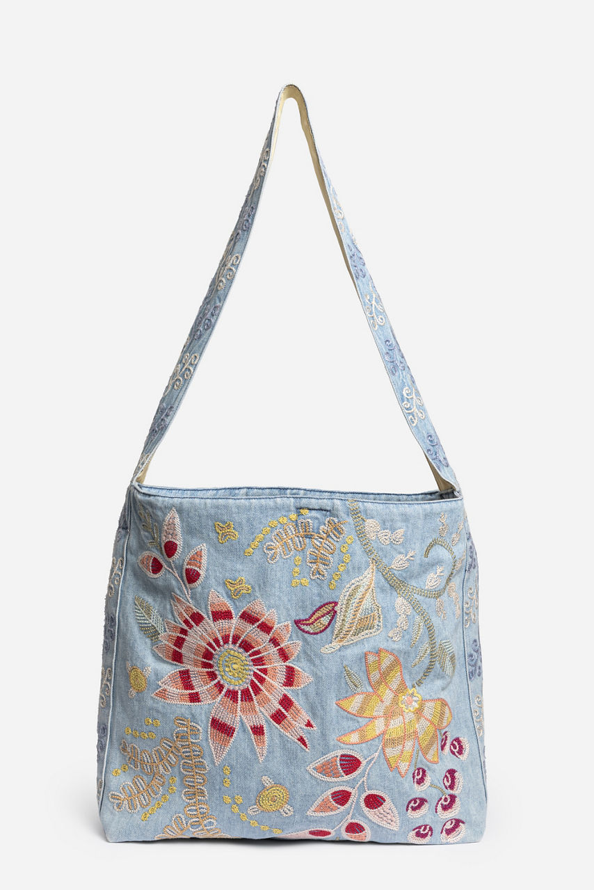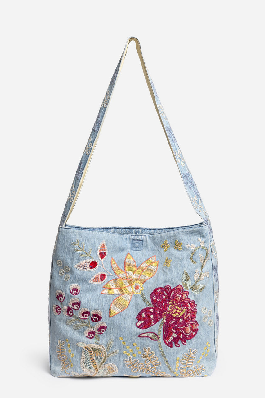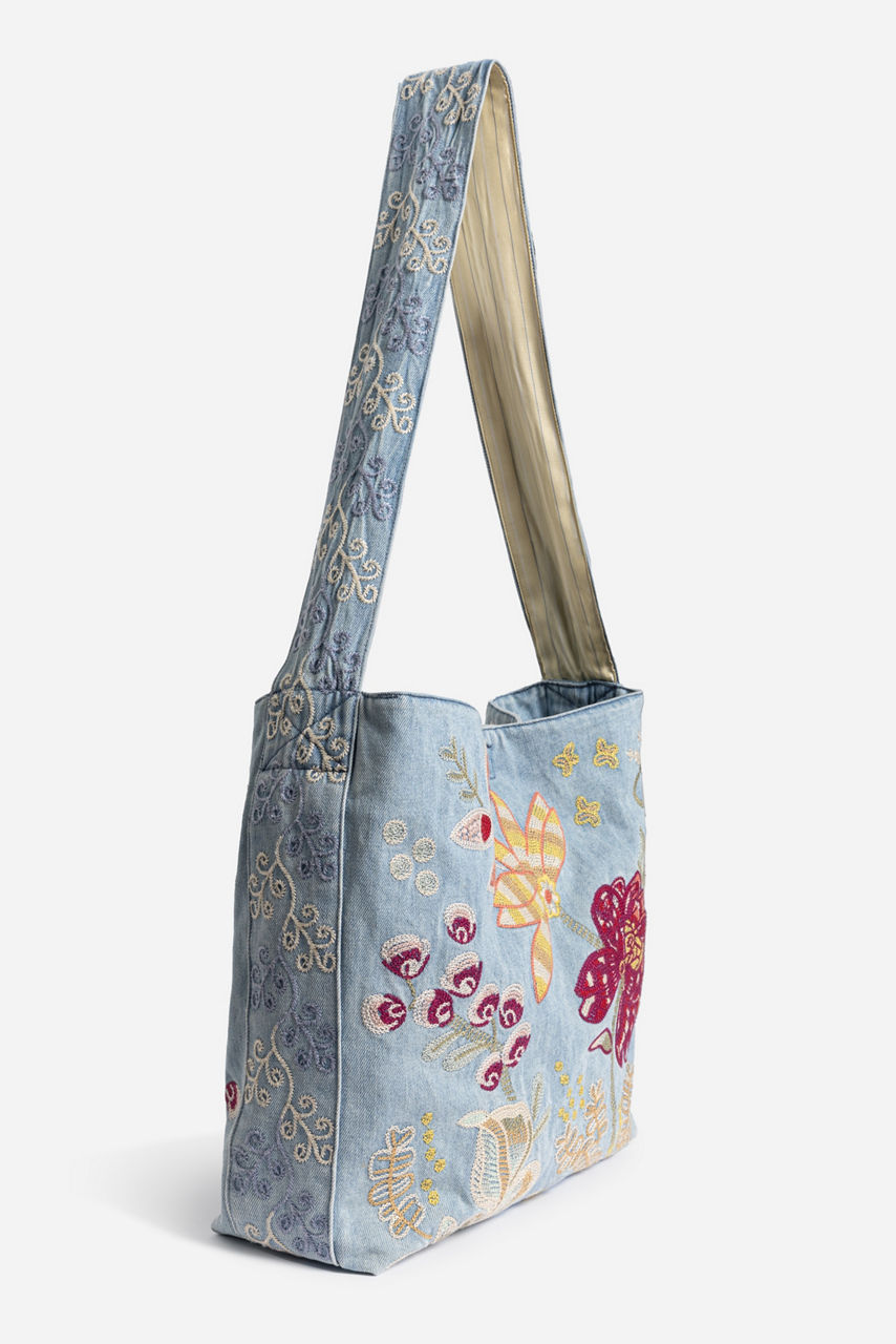 Uniquely adorned with vibrant floral embroidered details, the Wide Strap Denim Tote is crafted from a lightweight, durable material. Designed with a wide shoulder strap for comfort and an easily accessible open top, this bag is perfect for everyday use. Pair with a casual tee and cargo pants for a modern casual look.