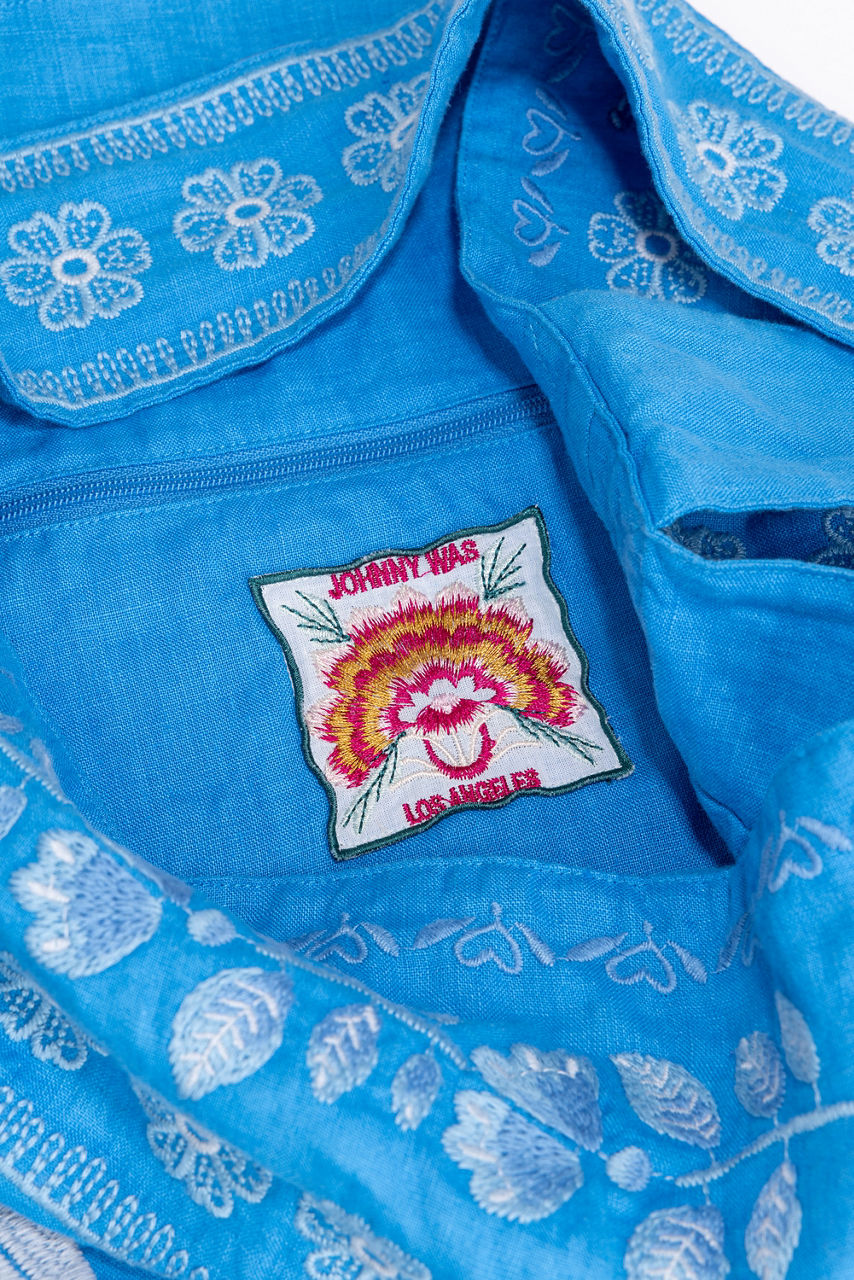 Embellished with intricate embroidered detailing, the Wide Strap Linen Tote Bag is perfect for everyday use. Crafted from 100% linen, this lightweight bag features a wide shoulder strap and a snap closure at the top. Use as a daily tote or fill with your favorite poolside essentials for a day in the sun.