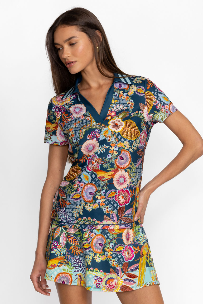 Defined by exquisite blooms, the Wild Bird Basic Polo Athletic Tee offers vibrant color and unparalleled style. Crafted from an environmentally conscious blend of recycled fabric, this unique top features a V-neckline and a classic polo collar. Pair with the Wild Bird tennis skirt and white sneakers for a polished weekend combination.