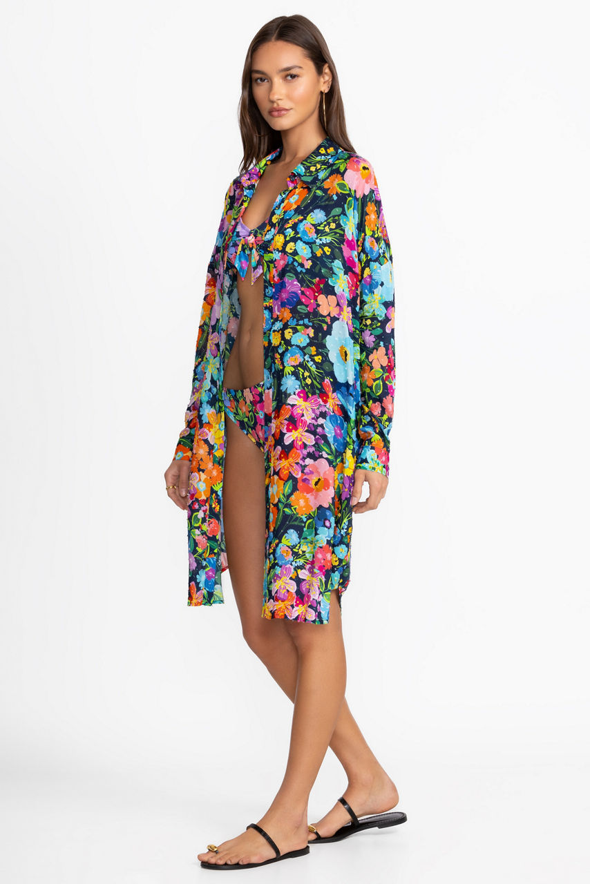 The Wild Bloom Long Shirt Dress is adorned with bold floral blossoms on a rich navy backdrop and perfectly combines comfort and elevated style. Featuring a classic collared button-front, this shirt dress is crafted from a lightweight, flowing fabric and is finished with a gently curved hemline for an elegant silhouette. Layer over the Wild Bloom Bikini Top and Side Tie Hipster bottoms for an unforgettable resort-ready look.