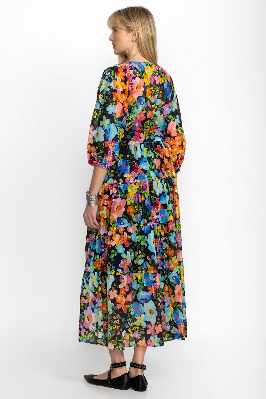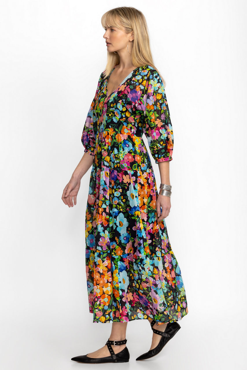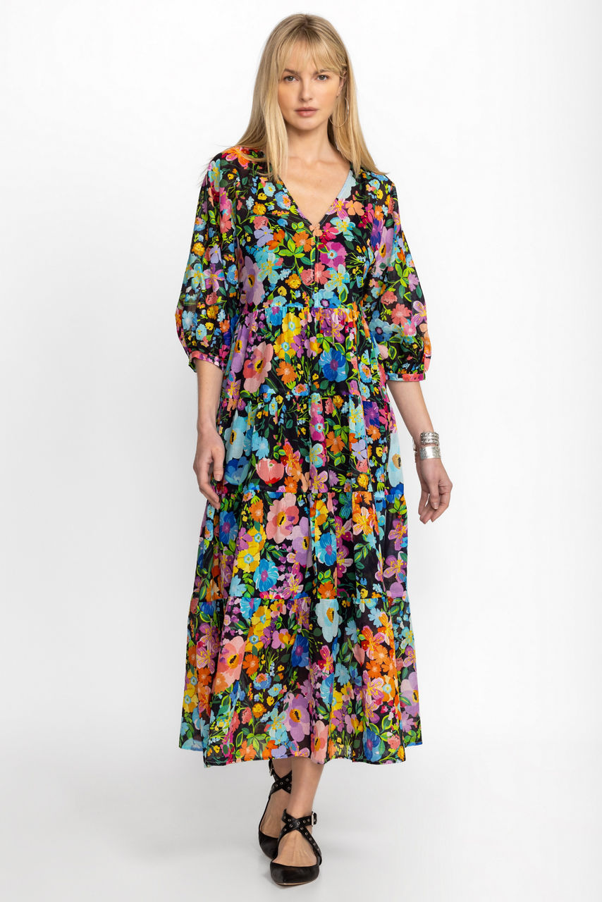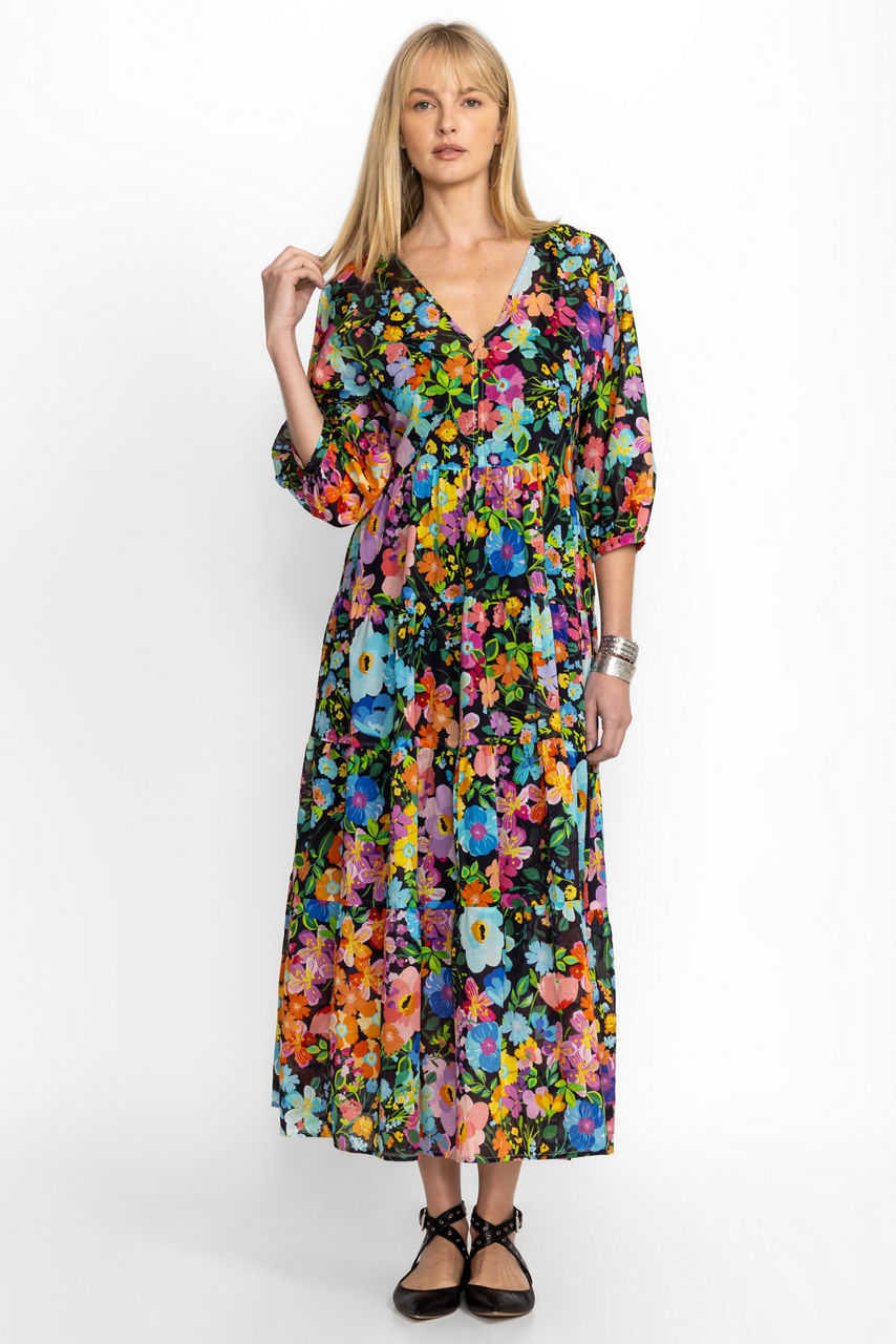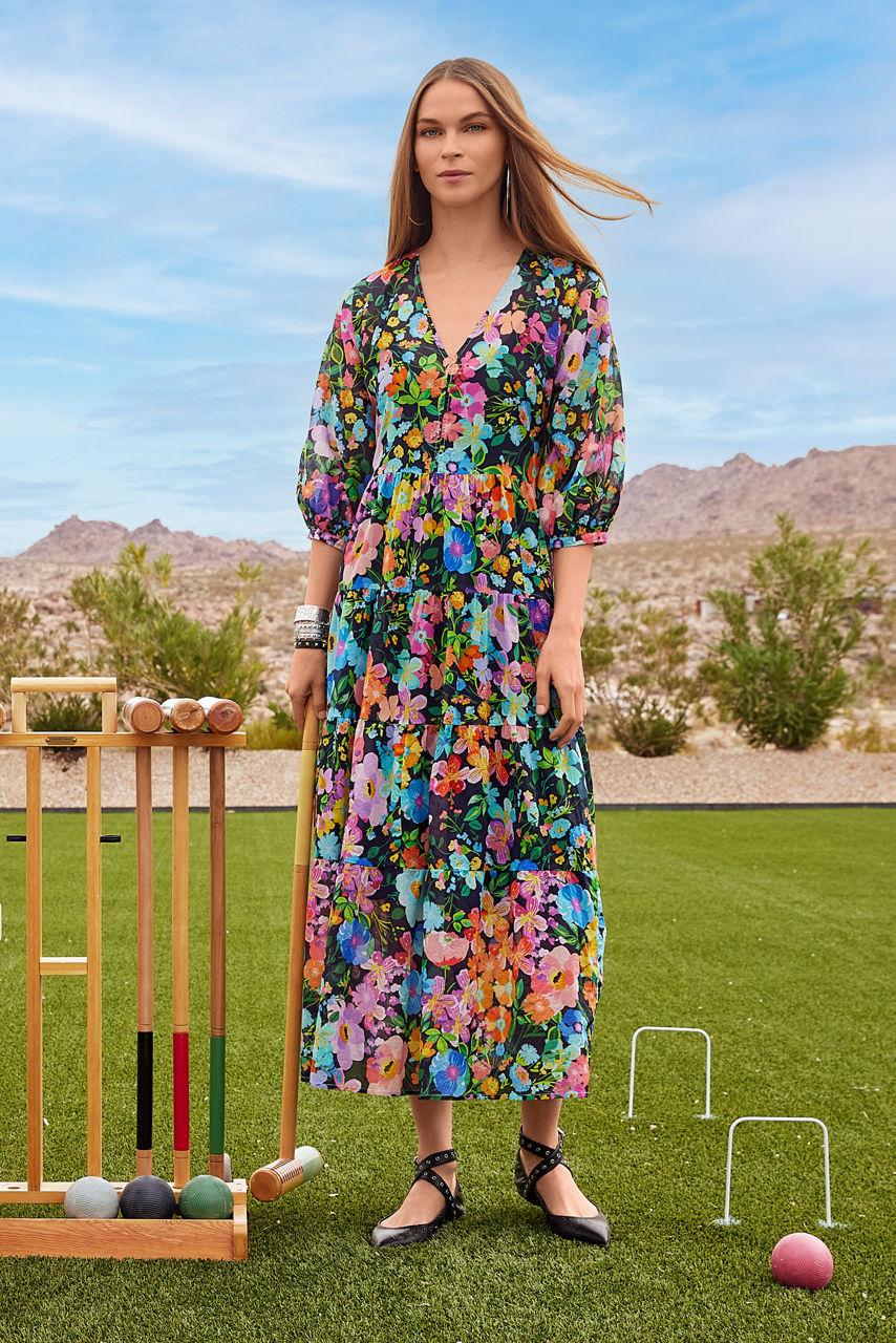 Crafted from 100% breathable cotton, the Wild Blooms Dolman Tiered Dress is the perfect combination of comfort and style. Featuring a V-neckline and empire waist, this tiered dress boasts gently puffed sleeves and bold pattern with an exotic array or brilliant blooms. Pair with wedge sandals and a colorful clutch for a casual dinner out.