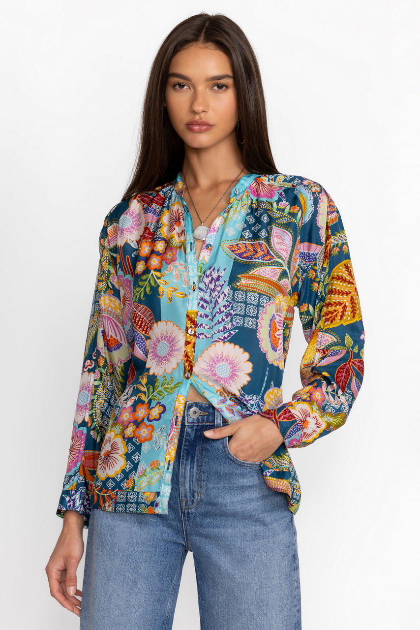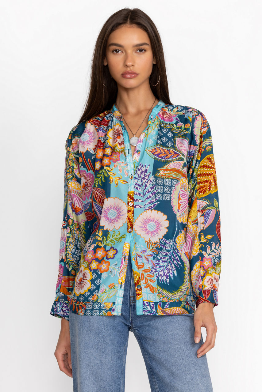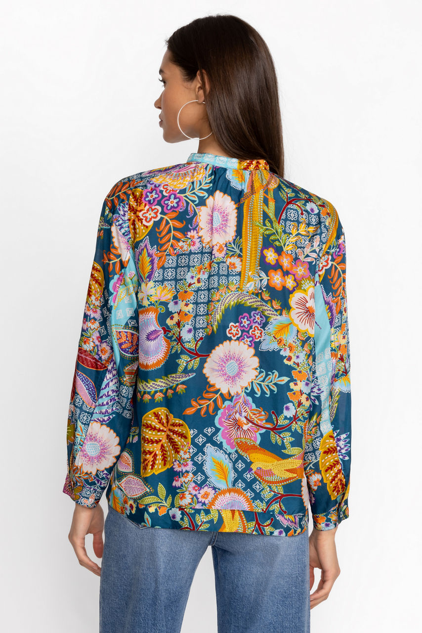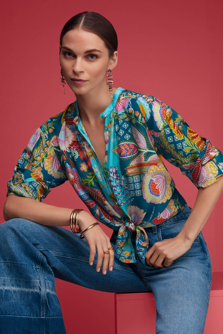 Crafted from 100% sumptuous silk, the Kalani Blouse offers a bold display of vibrant flora and fauna. Designed with a simple Nehru collar and relaxed raglan sleeves, this blouse features fabric covered buttons and cuffs. Pair with fitted black pants and leather flats to allow this stunning blouse to shine.
