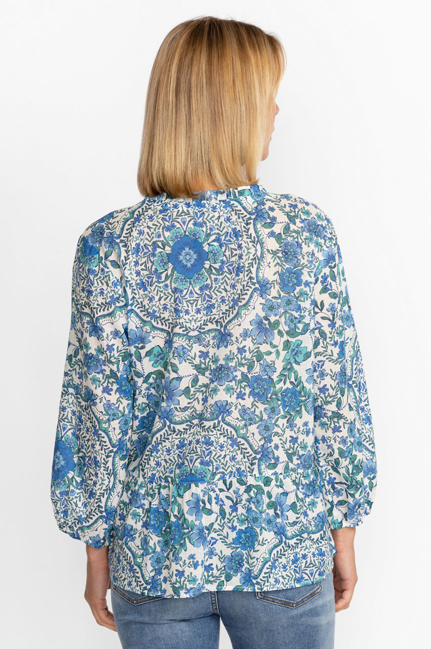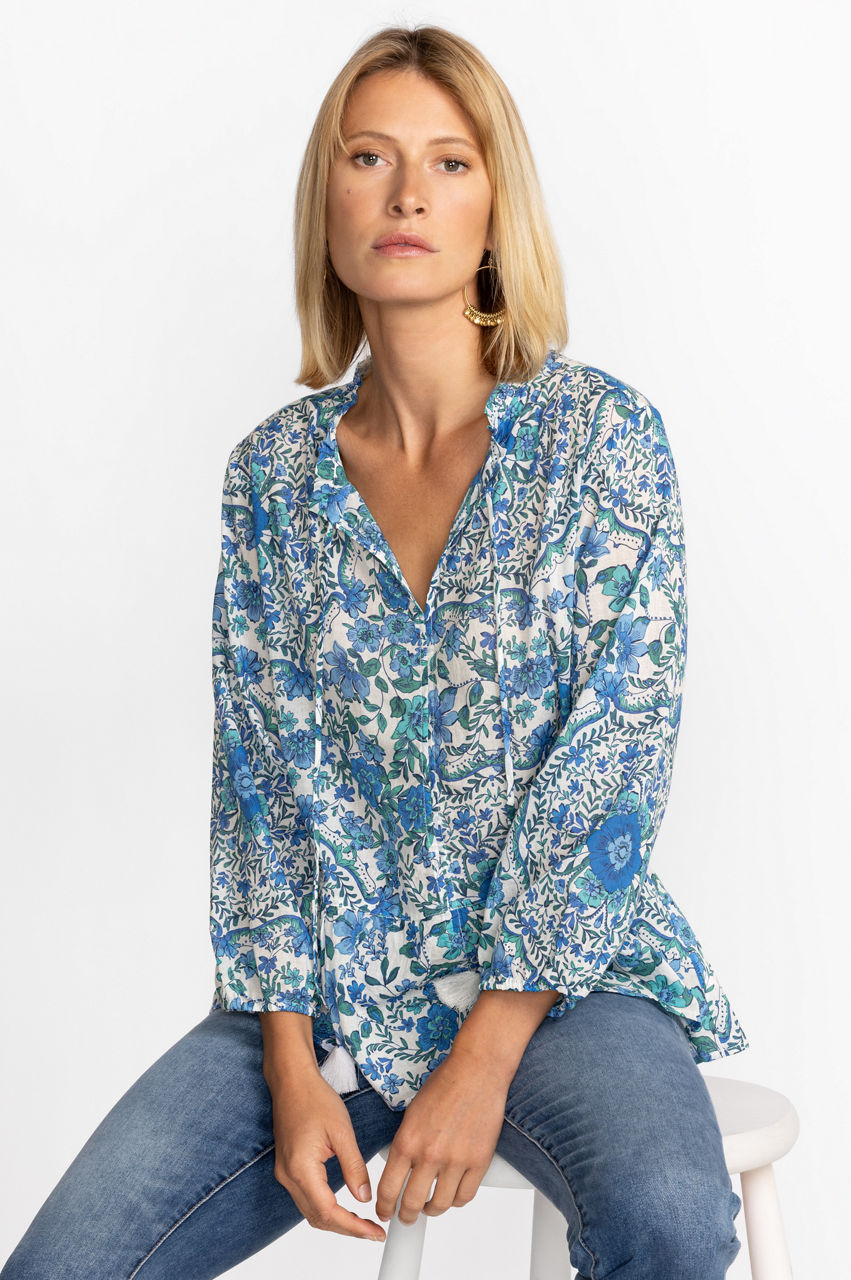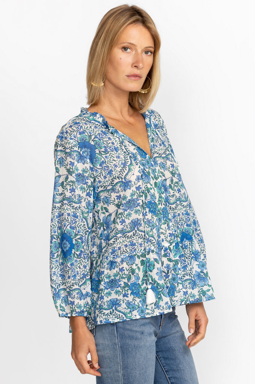 The Willow Blue Ruffled Field Blouse features pleasing cool tones and peasant sleeves to create a stylish and laidback aesthetic. Pair with a denim skirt and cowboy boots for a unique weekend option.