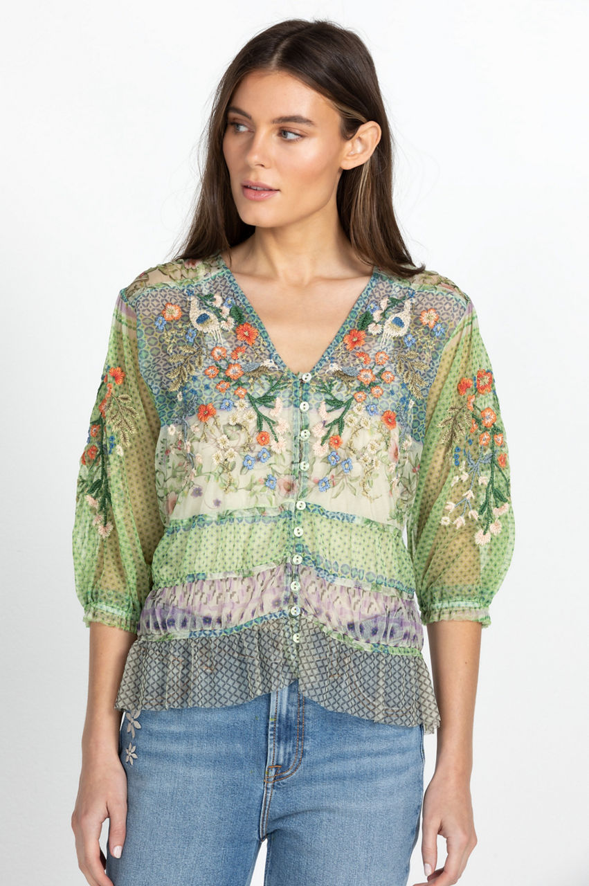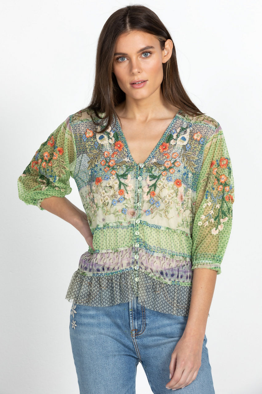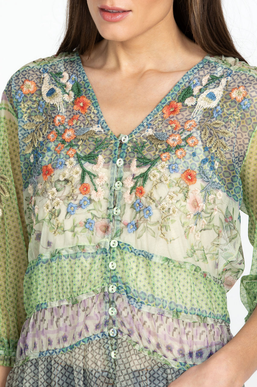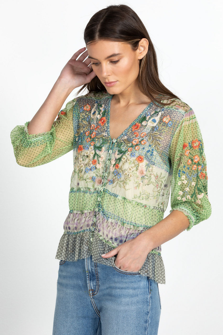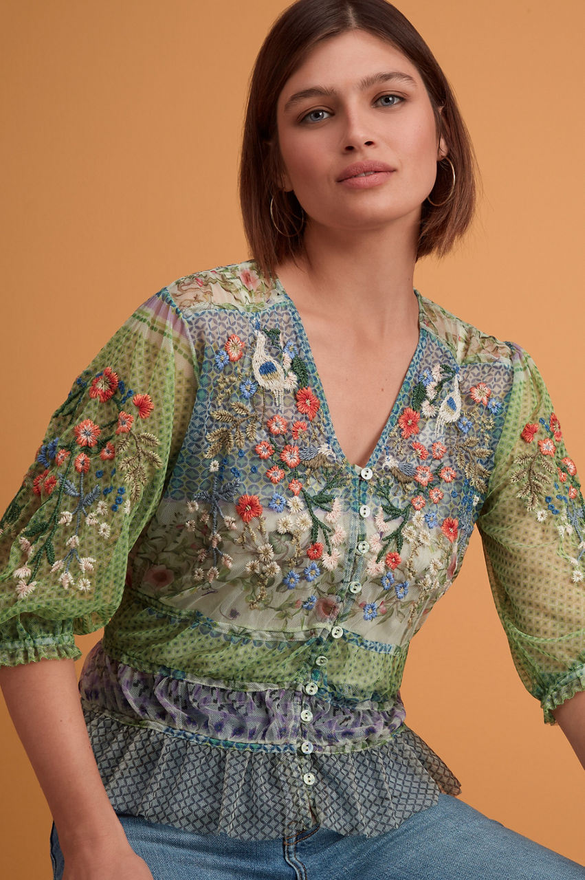 Ethereal with whimsical details, the Winx Mesh Blouse is swathed in dainty, feminine florals. This blouse is cut in a regular fit and features a V-neck, a front button closure, elastic shirred cuffs, and a shirred hemline. Finalized with an intricate placement embroidery, this blouse can be paired with denim for a casual daytime look or a maxi skirt for a romantic bohemian ensemble.