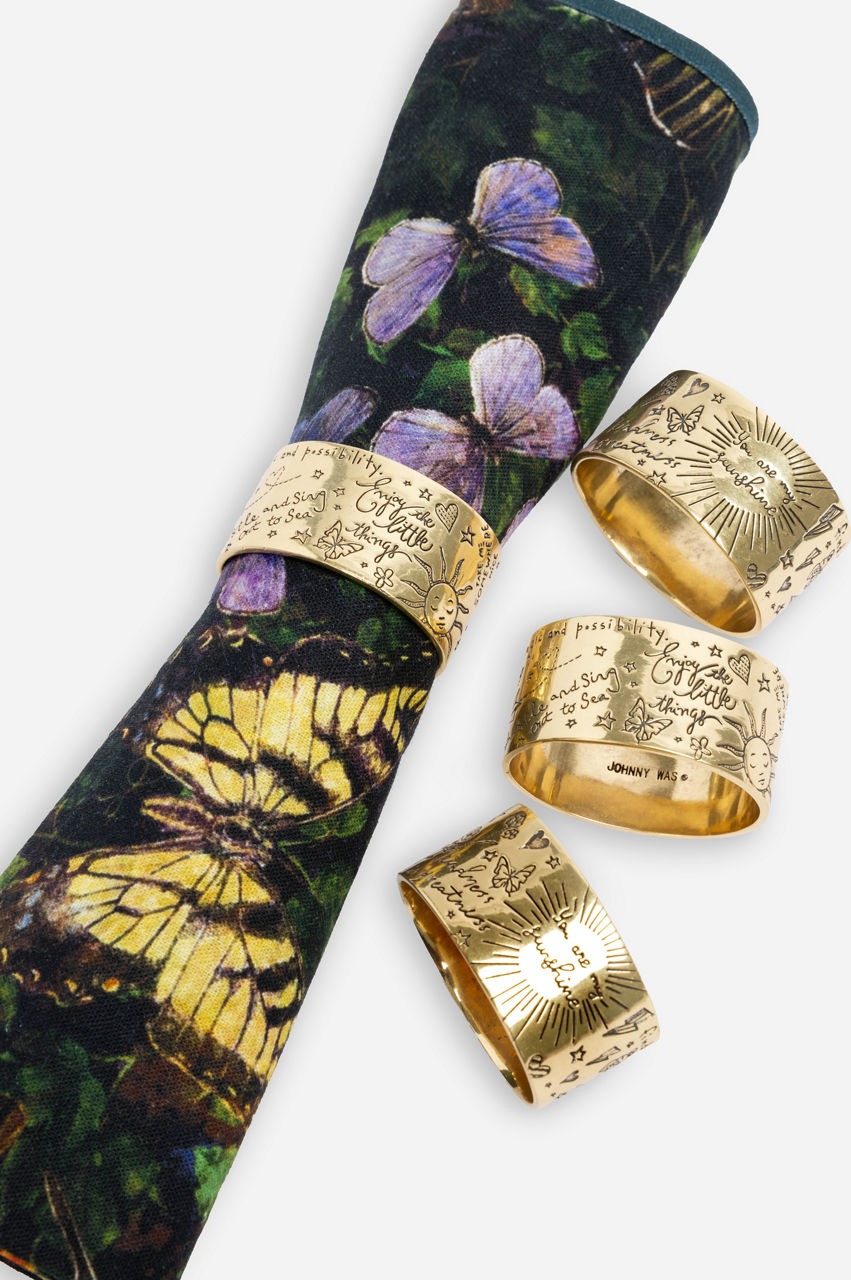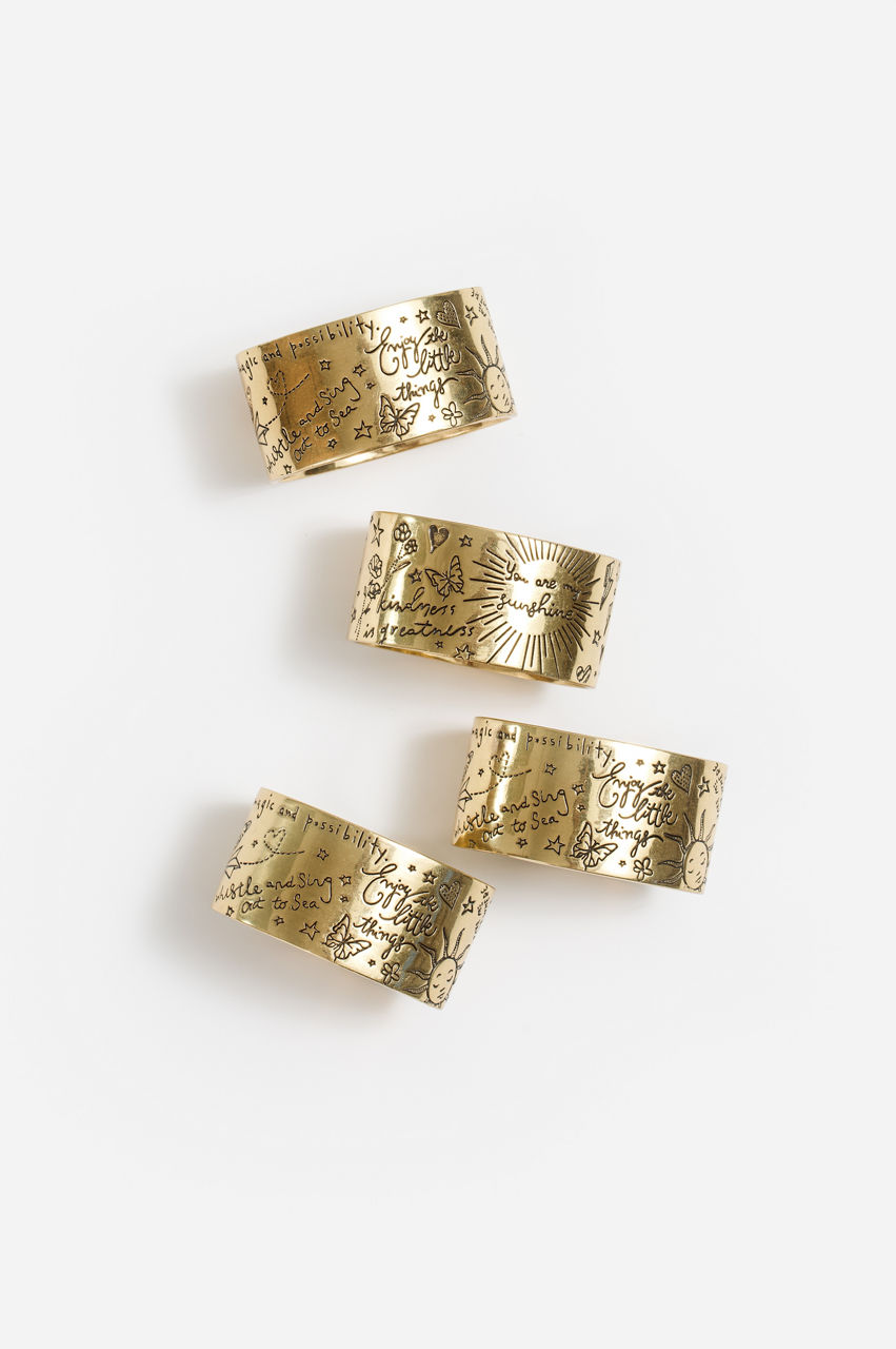 Serving up elevated dining in the comfort of your home, the Words of Kindness Napkin Rings add a dash of style to your tableware. Delivering beautifully embossed detailing on brass rings, this set of 4 unique napkin rings will leave your guests in admiration. Add to a casual place setting with vibrant cloth napkins.