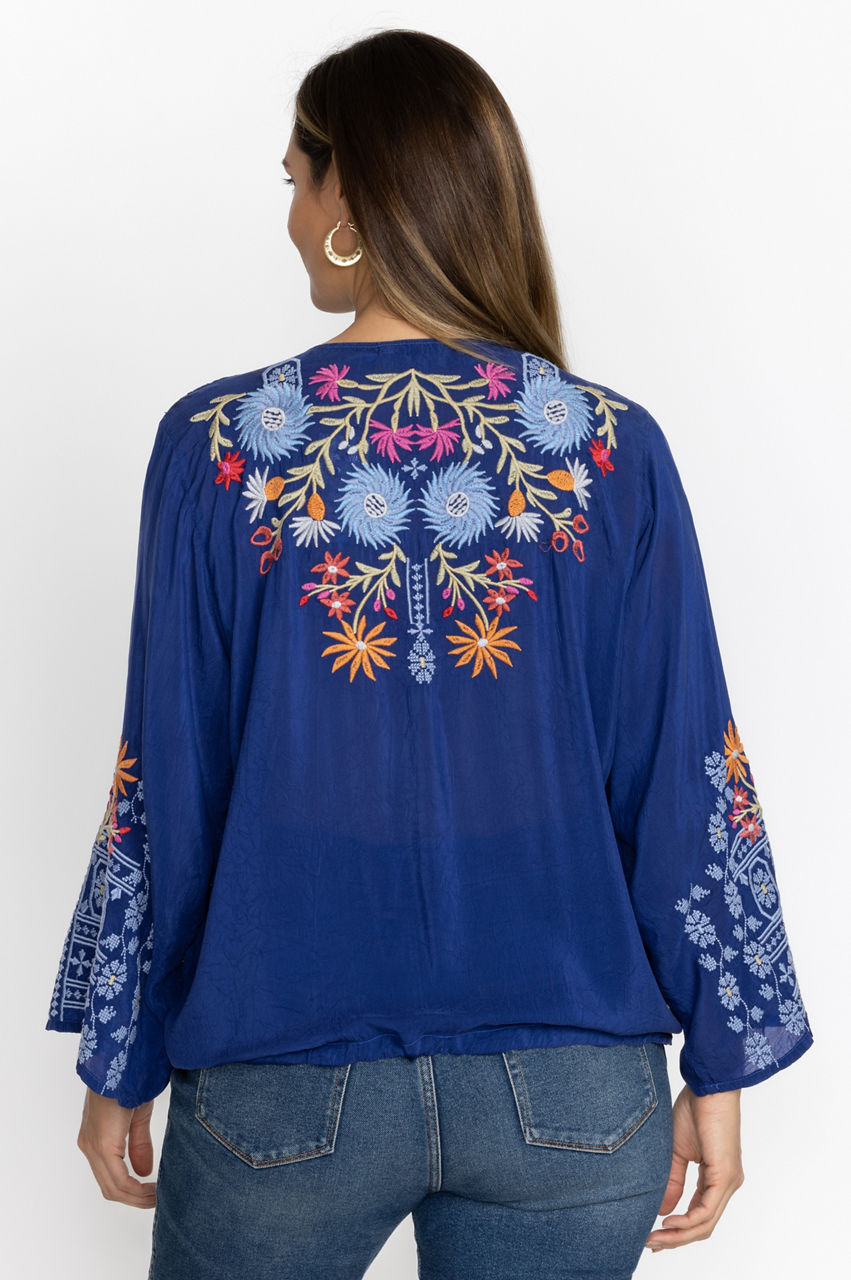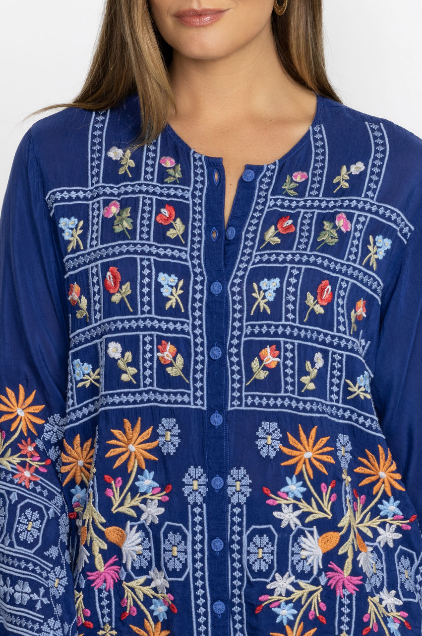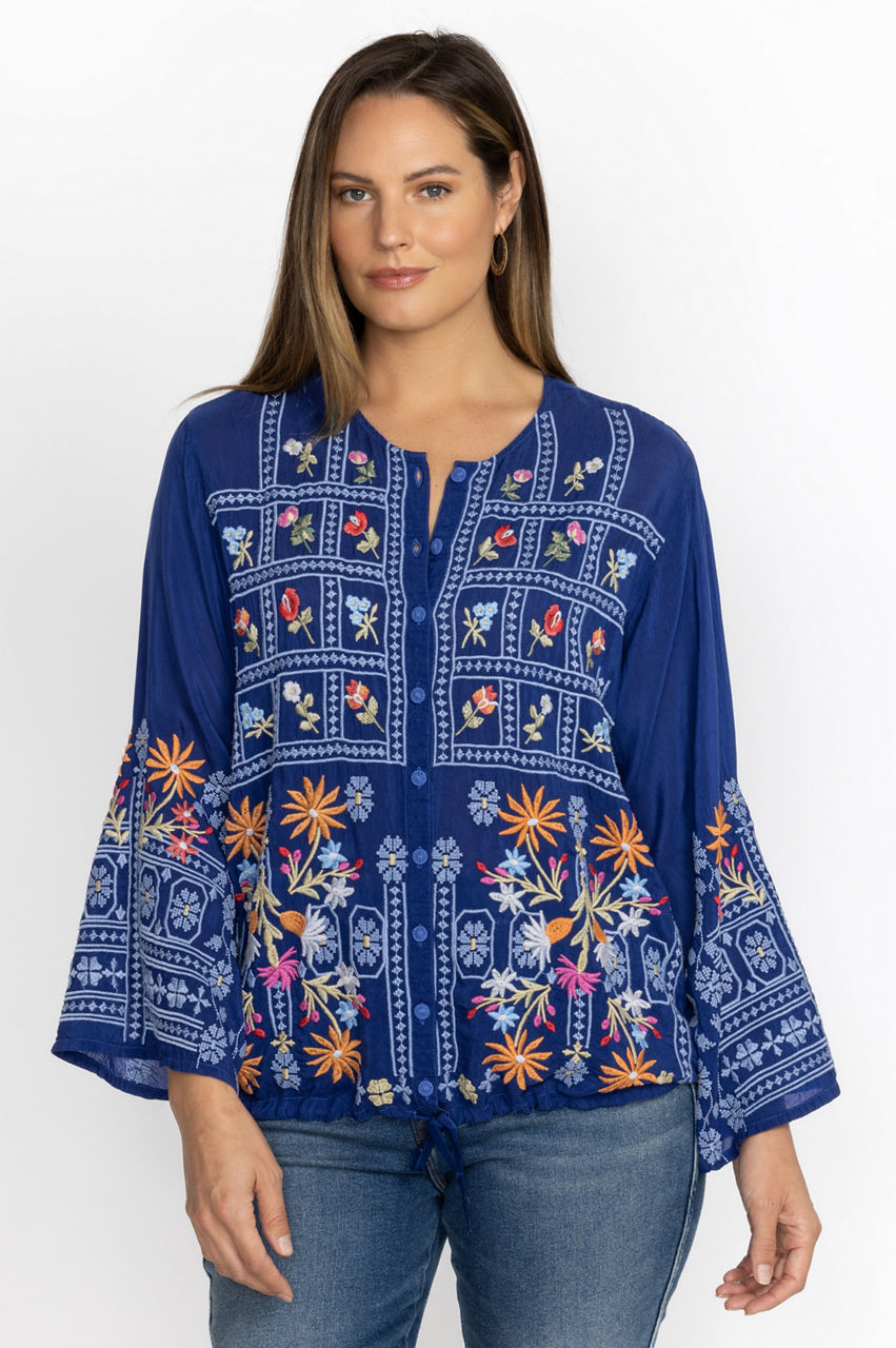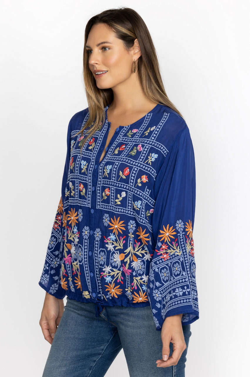 Imagined in a fresh color scheme, the Wyatt Blouse encapsulates the joys of sun-filled days. A modernized bohemian style, this blouse is crafted from rayon and showcases a placement embroidery of gorgeous flowers. Finished with a front button closure and a drawstring hem to shape the silhouette, this blouse can be worn with a white maxi skirt for a carefree feel.