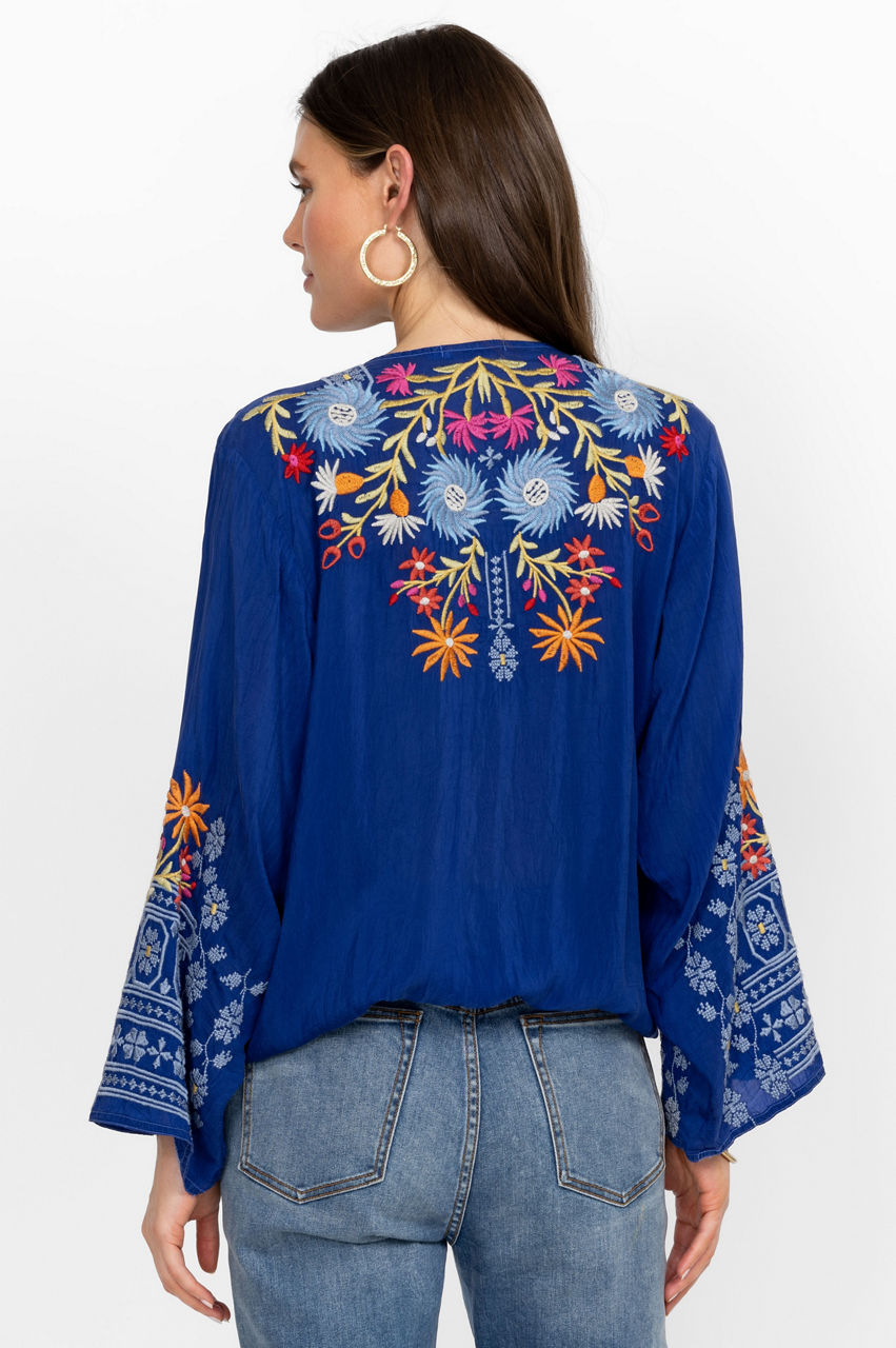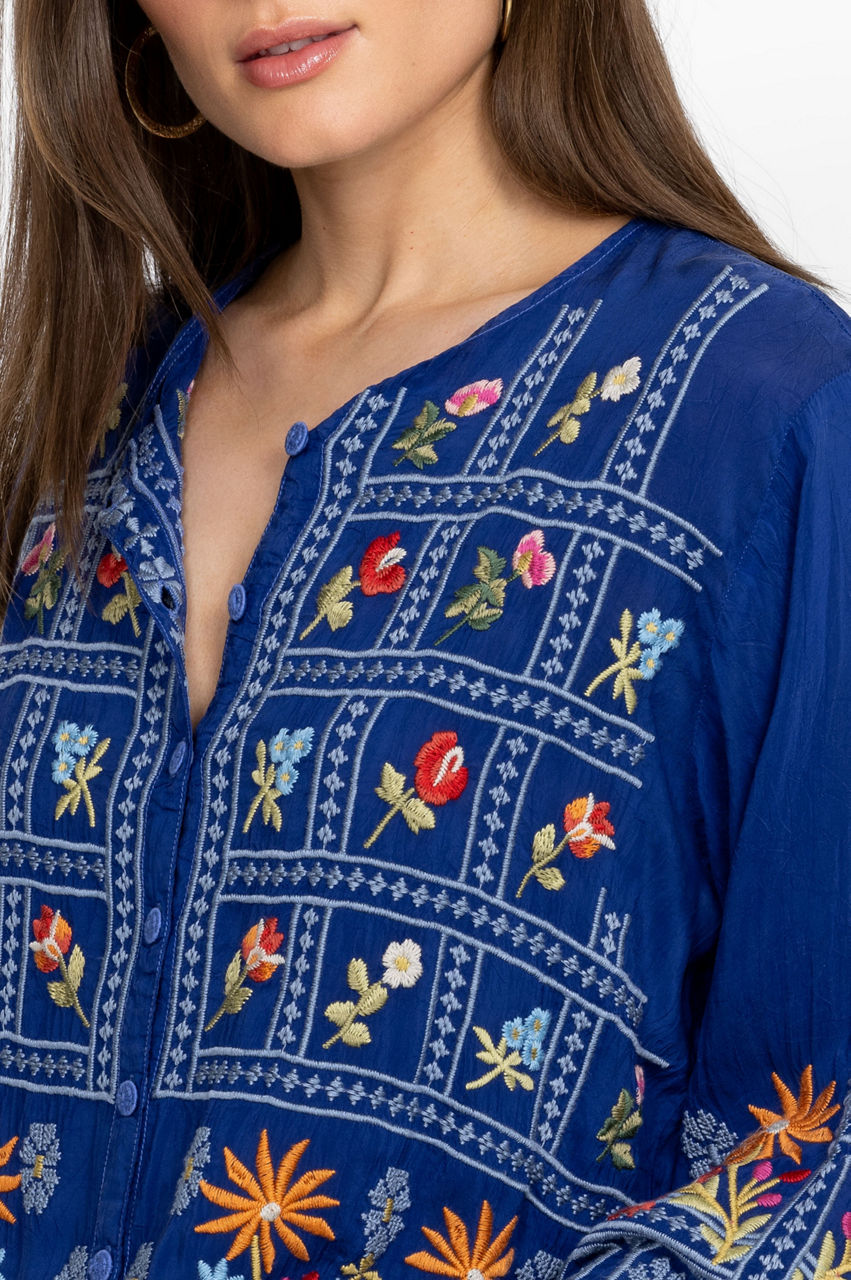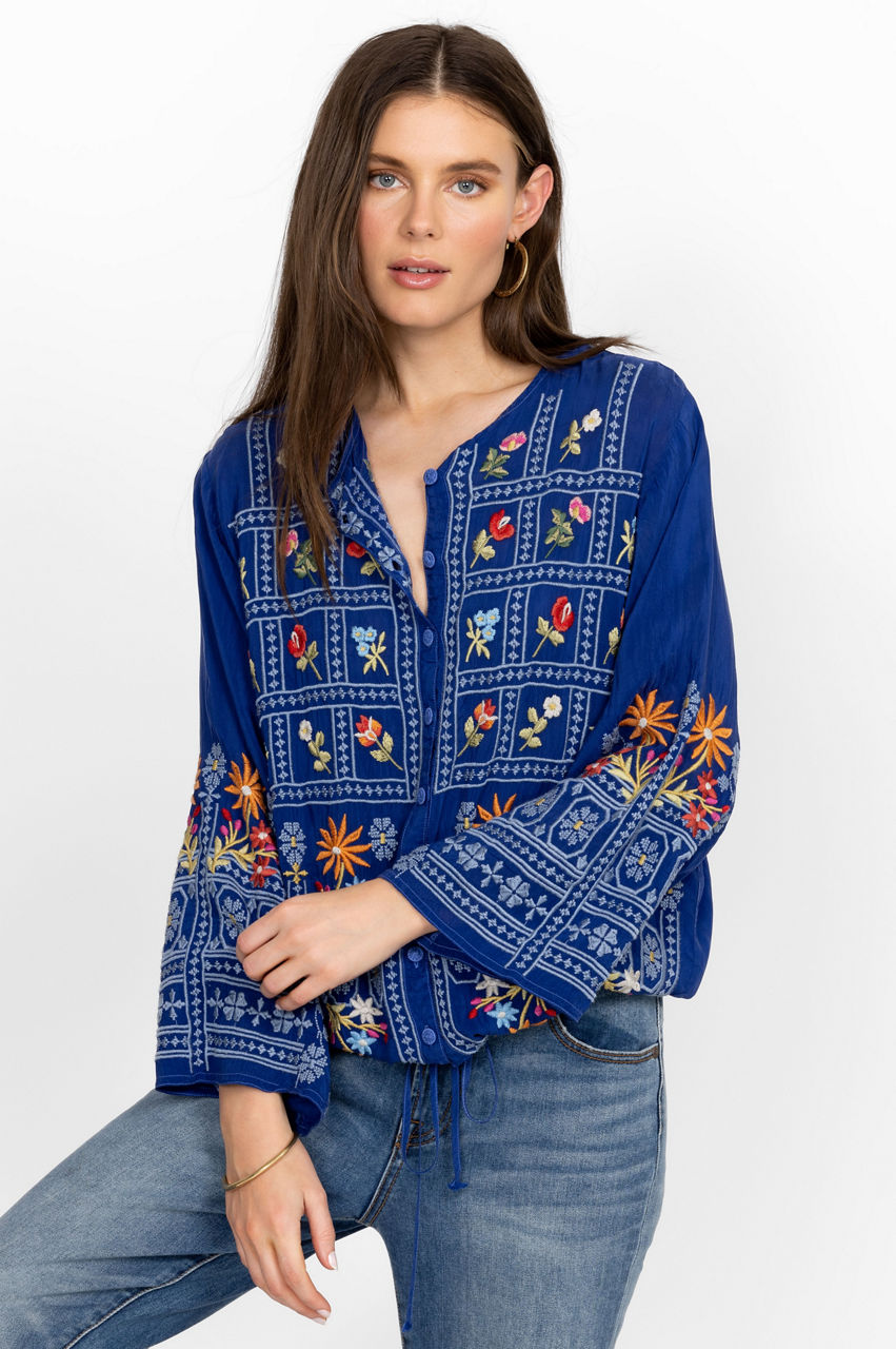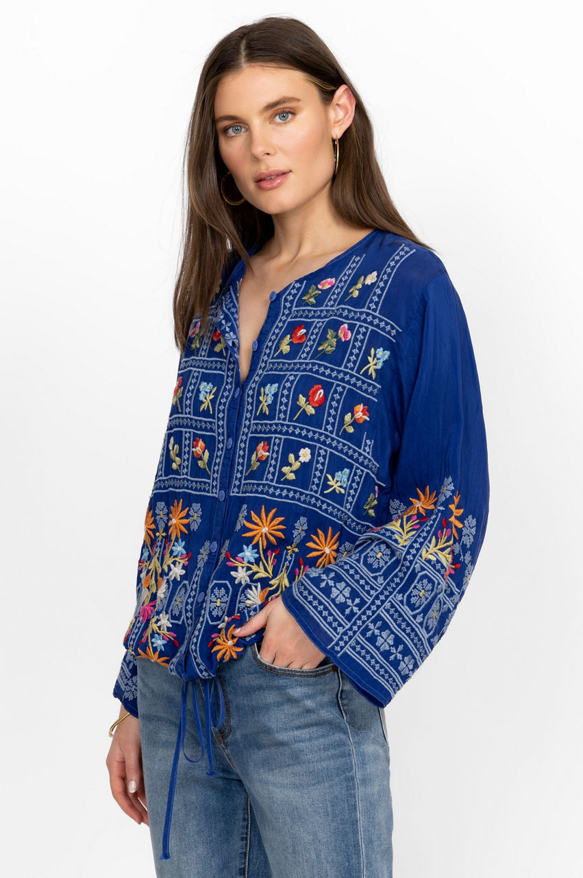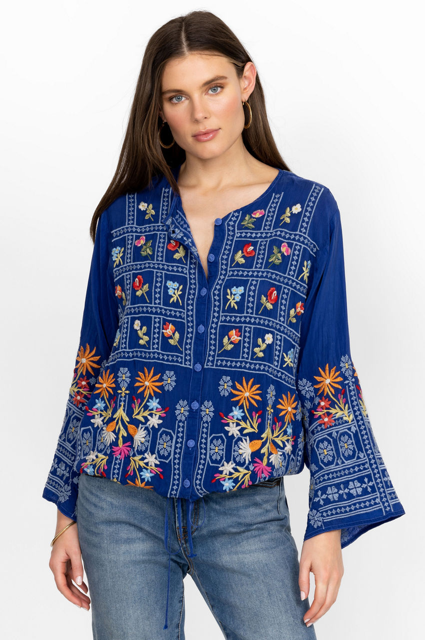 Imagined in a fresh color scheme, the Wyatt Blouse encapsulates the joys of sun-filled days. A modernized bohemian style, this blouse is crafted from rayon and showcases a placement embroidery of gorgeous flowers. Finished with a front button closure and a drawstring hem to shape the silhouette, this blouse can be worn with a white maxi skirt for a carefree feel.