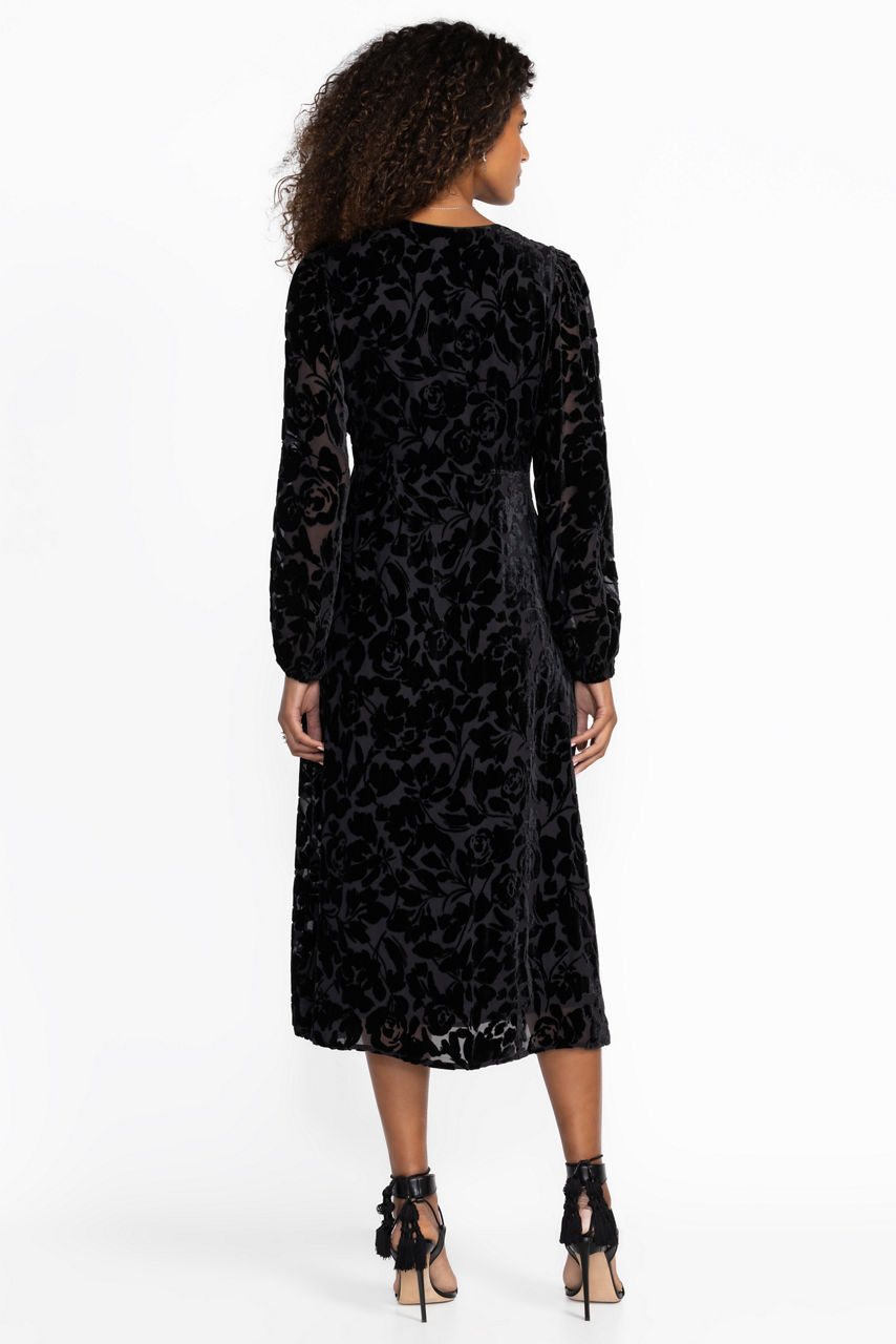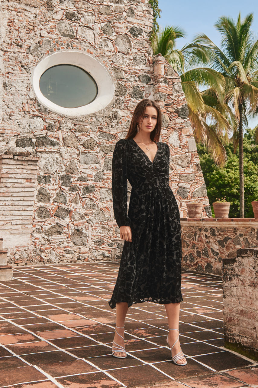 Embellished with a tone-on-tone floral pattern, the Wynnter Midi Dress is designed with a vintage-inspired feminine silhouette. Featuring a deep V-neckline and accented with pintucks at the shoulder line, this classic dress is finished with billowing Bishop sleeves and a hidden back zipper. Pair with kitten heels and delicate jewelry for an unforgettable evening look.