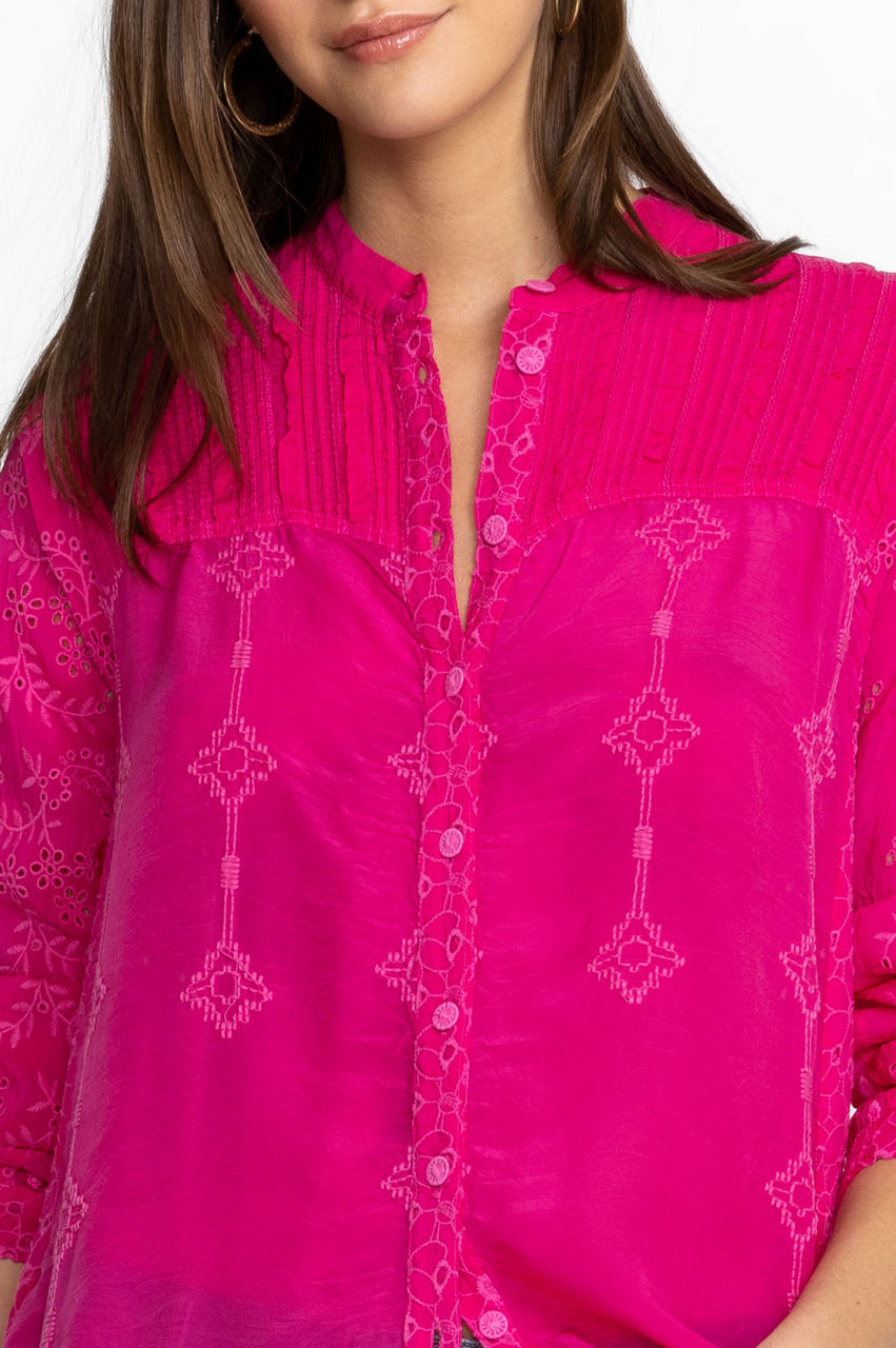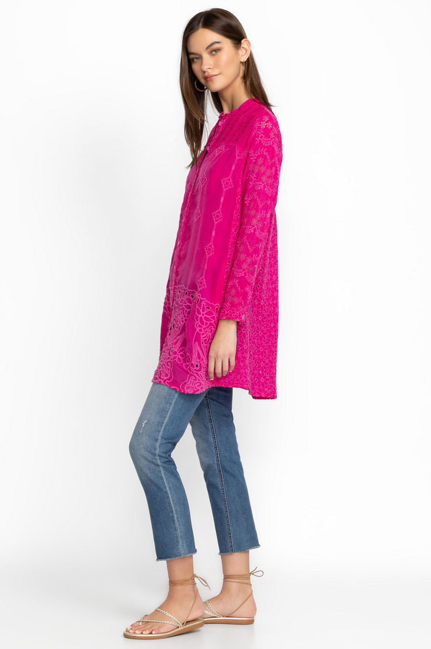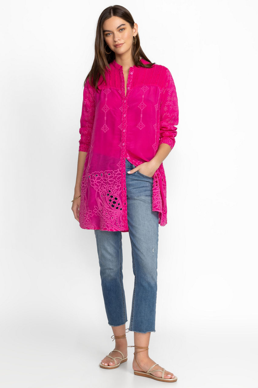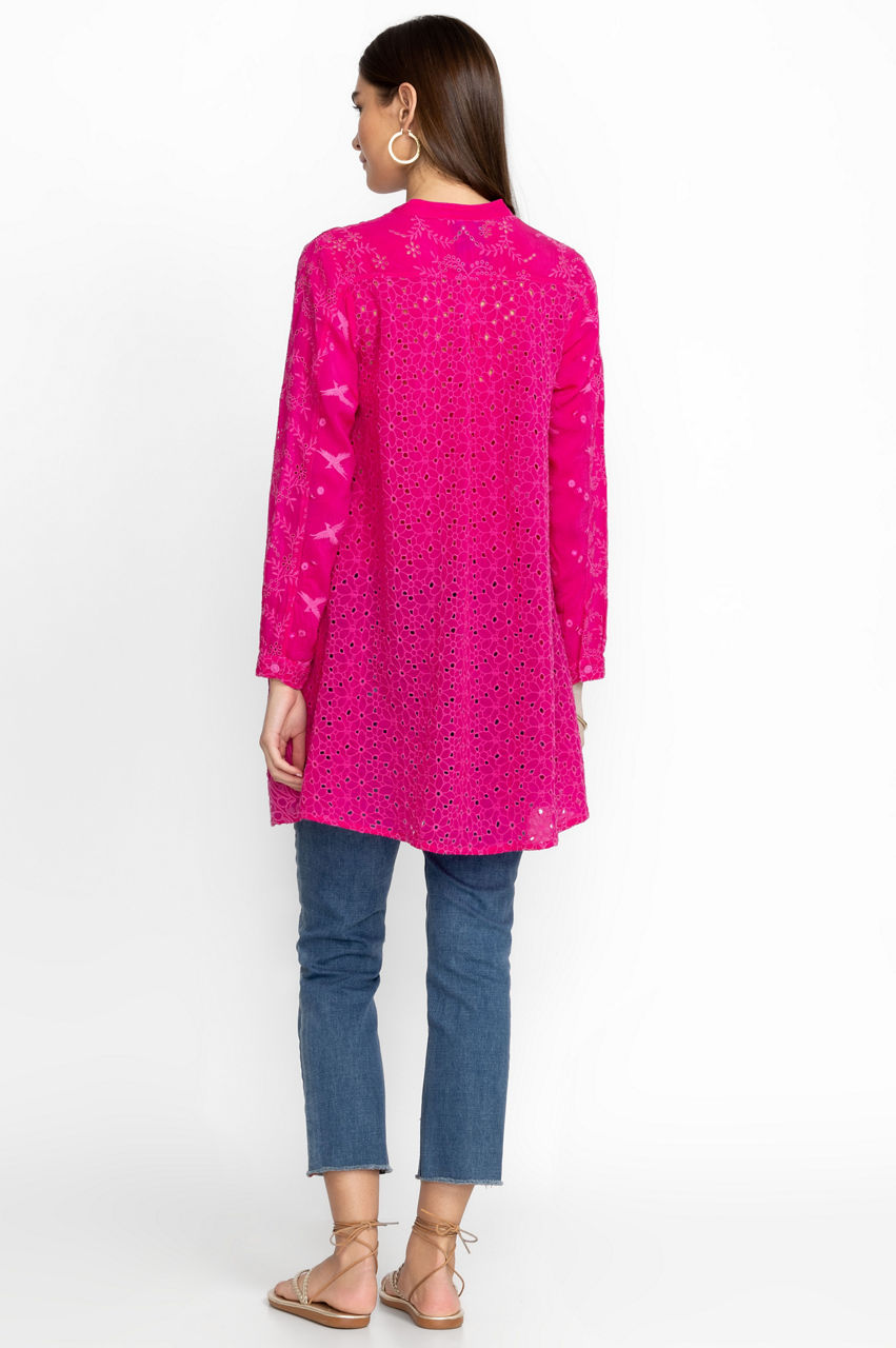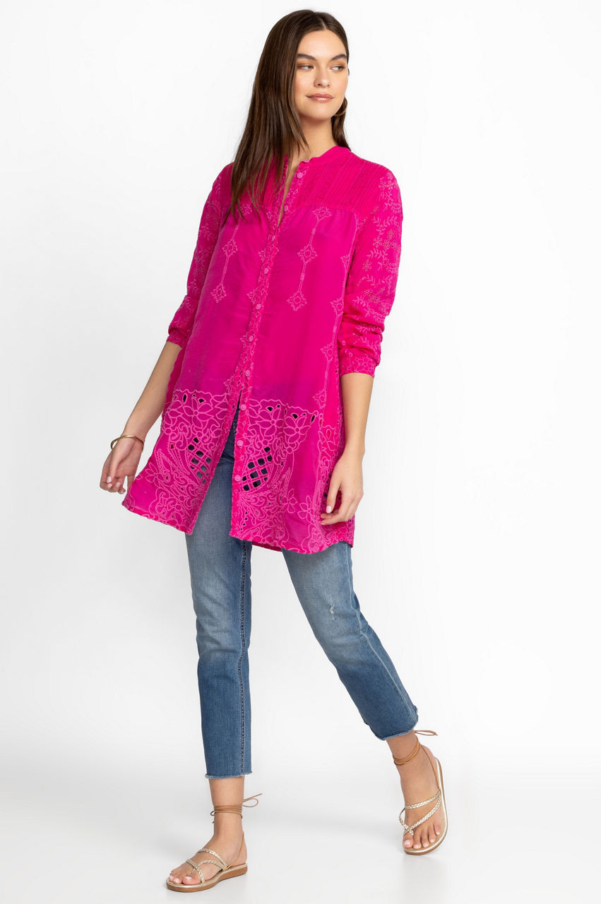 Cloaked in intricate motifs, the Xander Pamina Tunic is reminiscent of verdant countryside fields and warm days spent in the sun. This tunic falls to a slightly longer length and features a round neck, a front button closure, long sleeves, and a detailed embroidery across the front and back. Pair with plain pants and sandals for a sophisticated yet nonchalant take on daytime fashion.