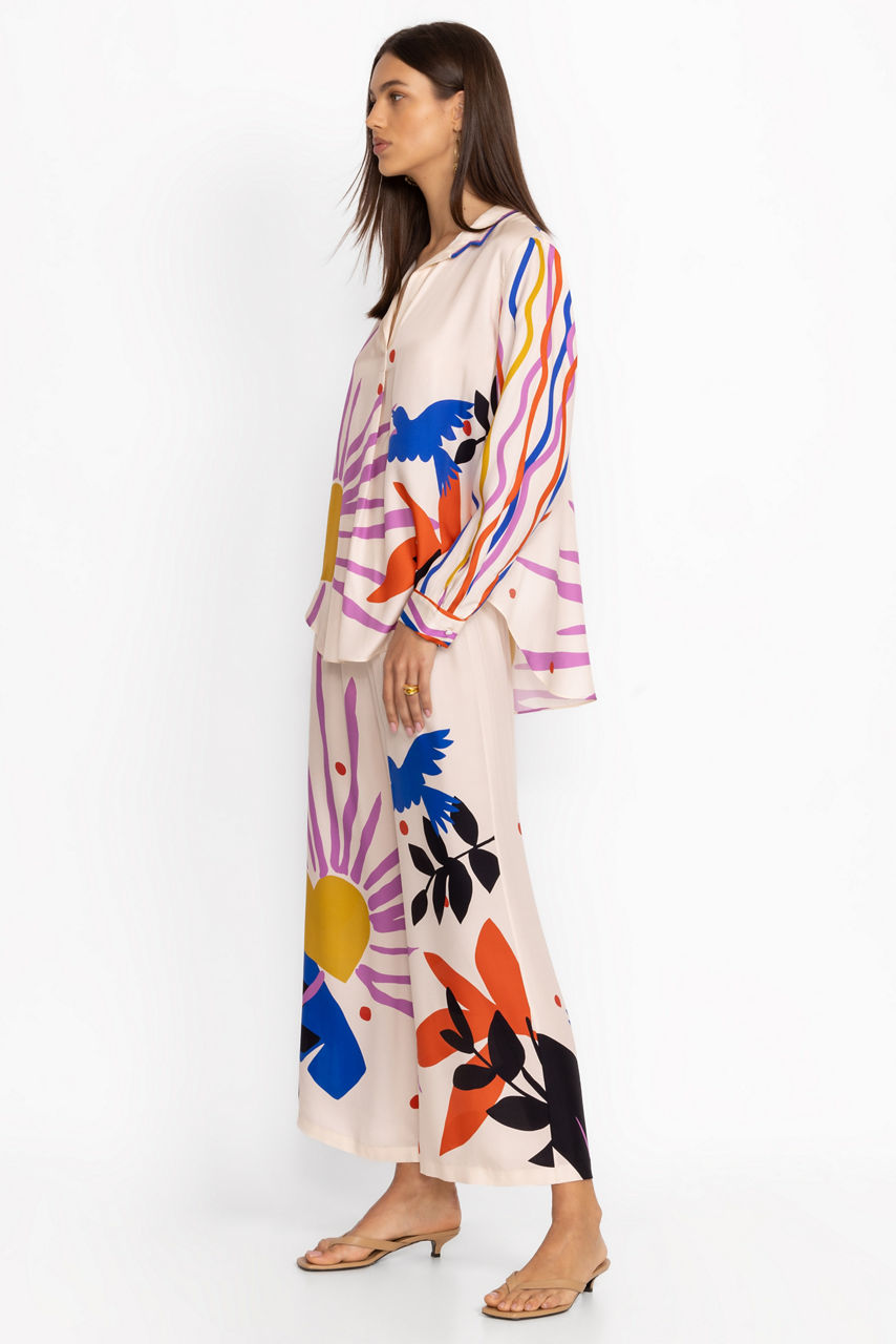 Sport an eclectic summer look in the floral graphics of the Yasmin Cropped Easy Pant. Crafted from a silk blend, the elasticized waistband leads to a wide opening at the ankle, creating a graceful flow. Pair with open toe sandals or heels for a beach resort ready look.