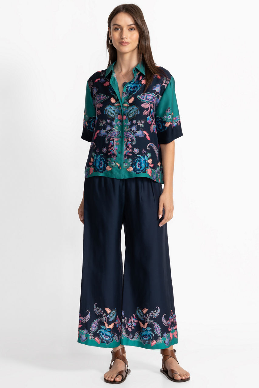 The Yasmin Cropped Easy Pants are crafted from a unique silk blend with a hint of stretch. Designed with an elastic waist and flared hem, these flowing pants are embellished with a vibrant paisley design and cut with a cropped leg. Pair with a coordinating tee and a classic denim jacket for a colorful casual ensemble.