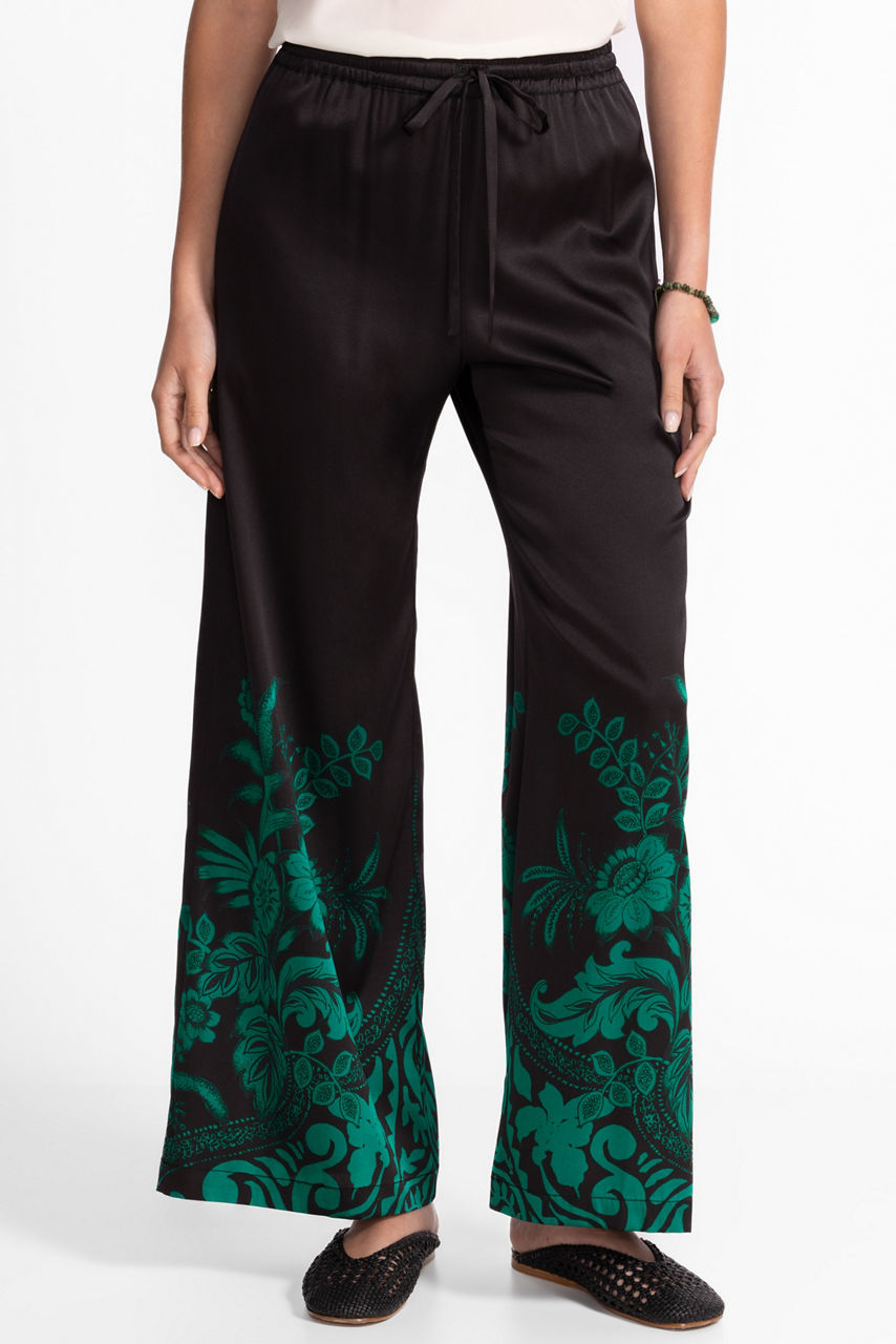 Crafted from a silk blend with a hint of stretch, the Yasmin Pants are adorned with a bold jade floral pattern. Featuring an elastic waist with a drawstring for a customizable fit, these pants are finished with a flared leg and on-seam pockets. Pair with a jade silk blouse and wedge heels for a resort-inspired look.