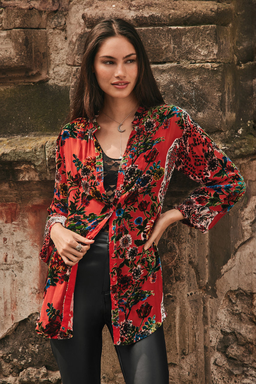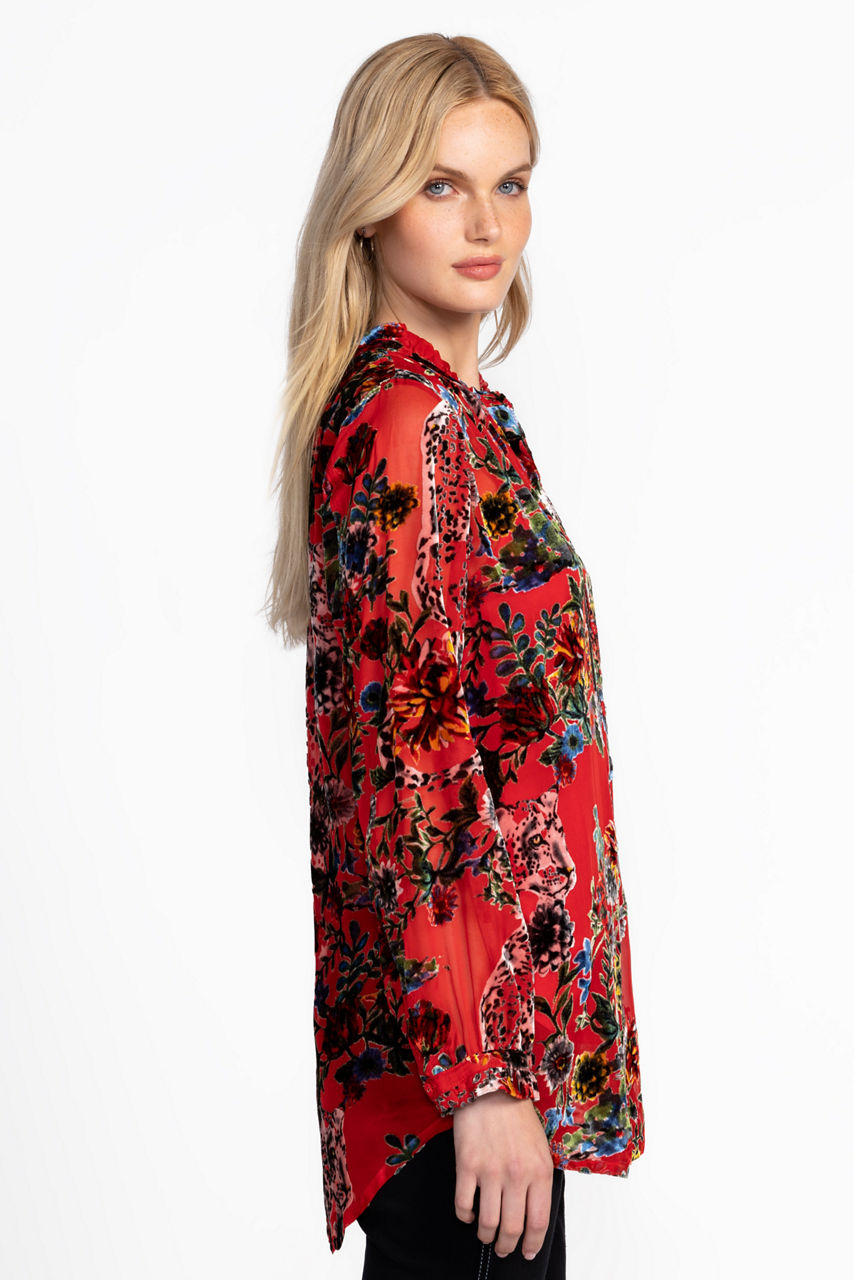 Washed in rich color and adorned with vibrant floral patterns, the Yoella Burnout Tunic is crafted from a lightweight silk blend. Designed with a delicate ruffled collar and a classic button-front, this bold, slip-lined blouse is finished with ruffling at the sleeve cuffs. Pair with classic trousers and leather flats for a modern work ensemble.
