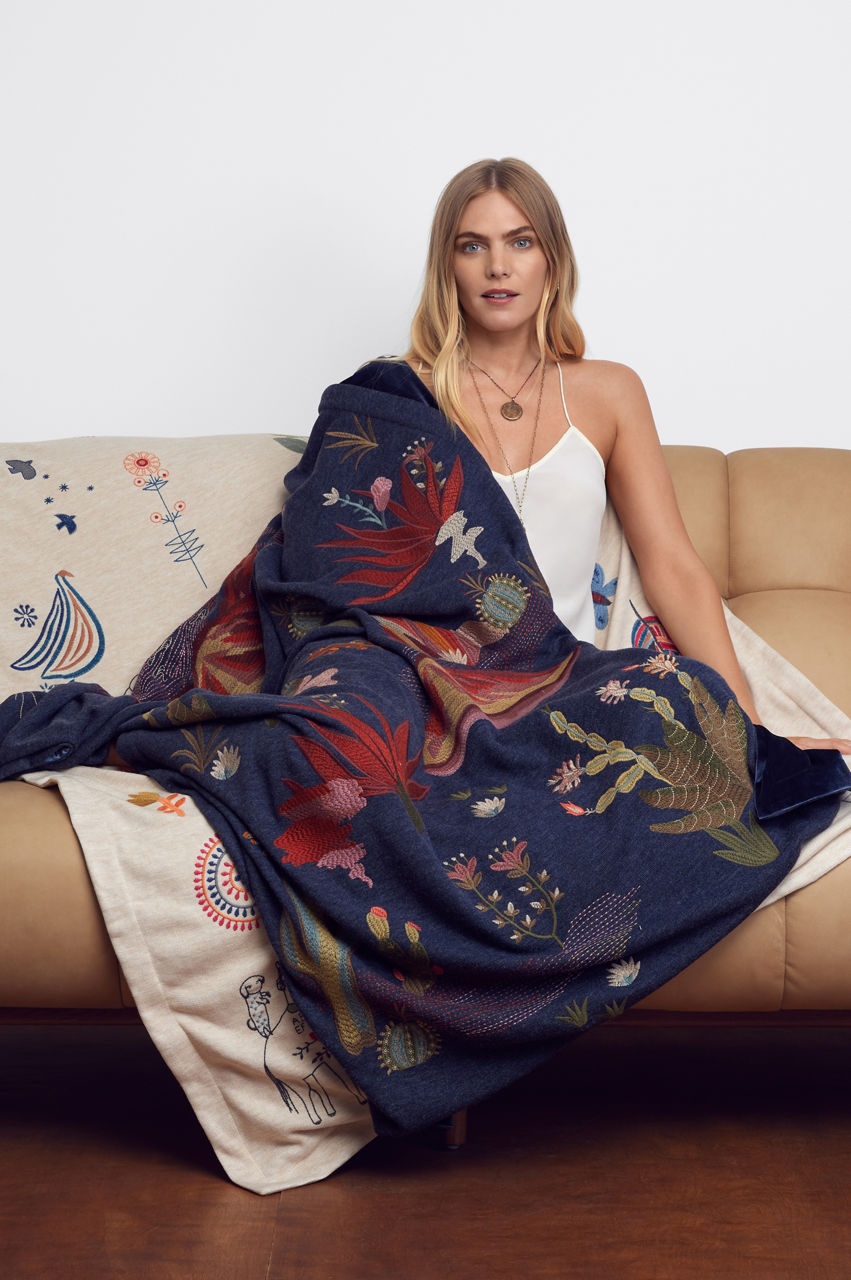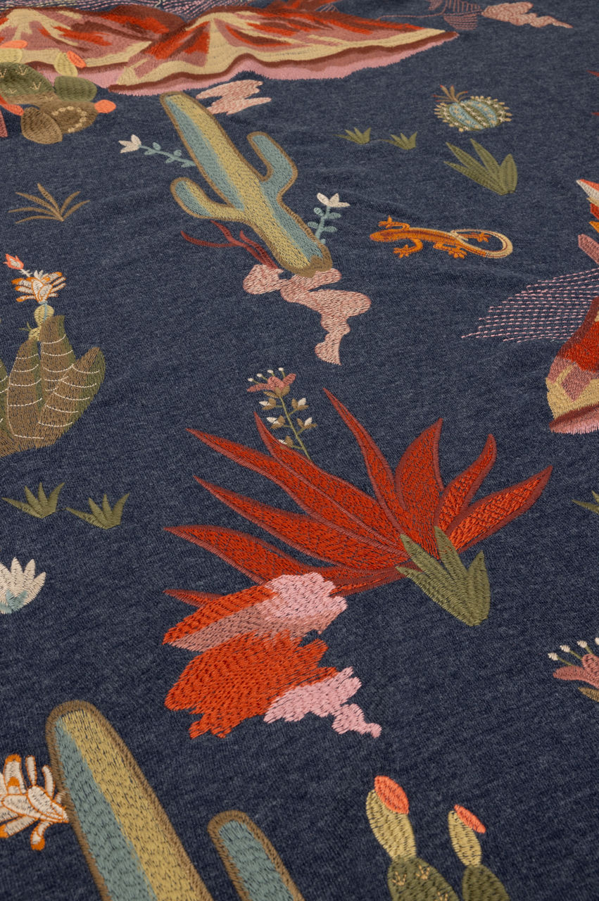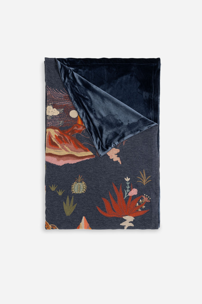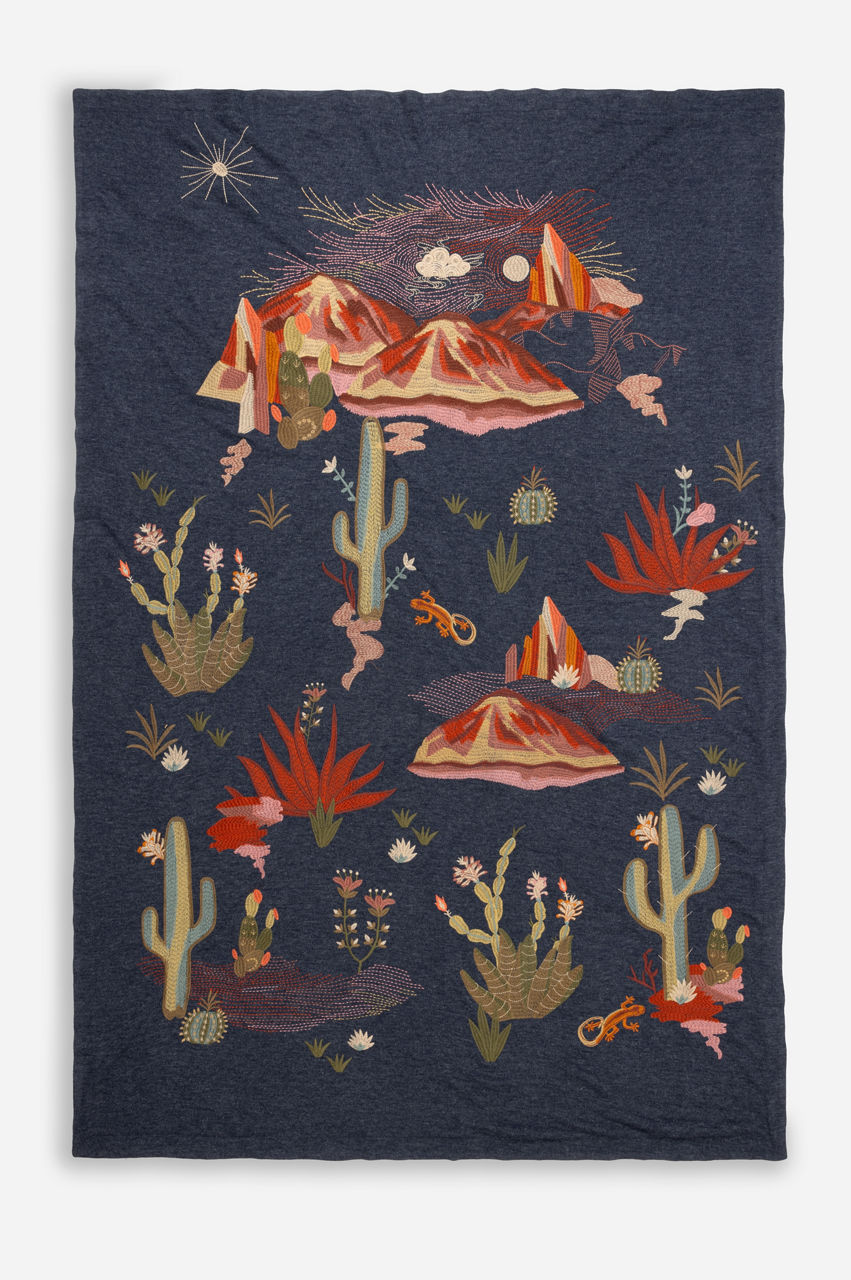 Featuring desert scenes reminiscent of the stunning southwest, the Yucca Throw Blanket is rich in color and design. Displaying colorful placement embroidery on a field of deep navy blue, this blanket is a beautiful home addition. Place as a decorative throw to add a splash of visual interest to a living space.