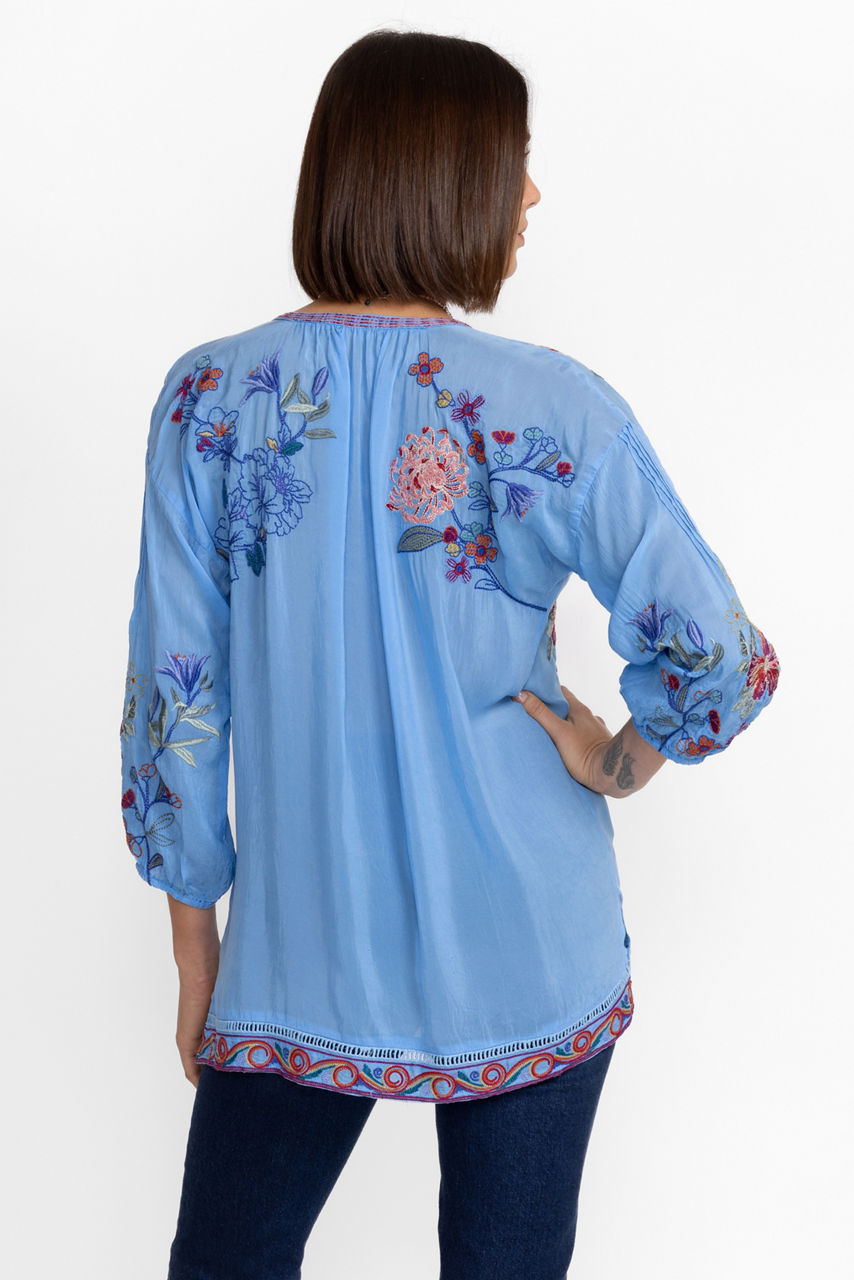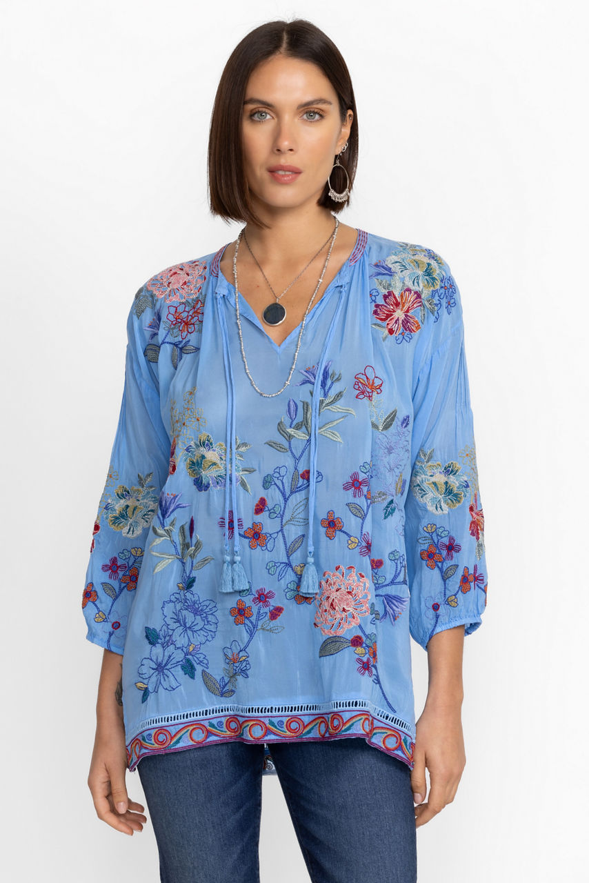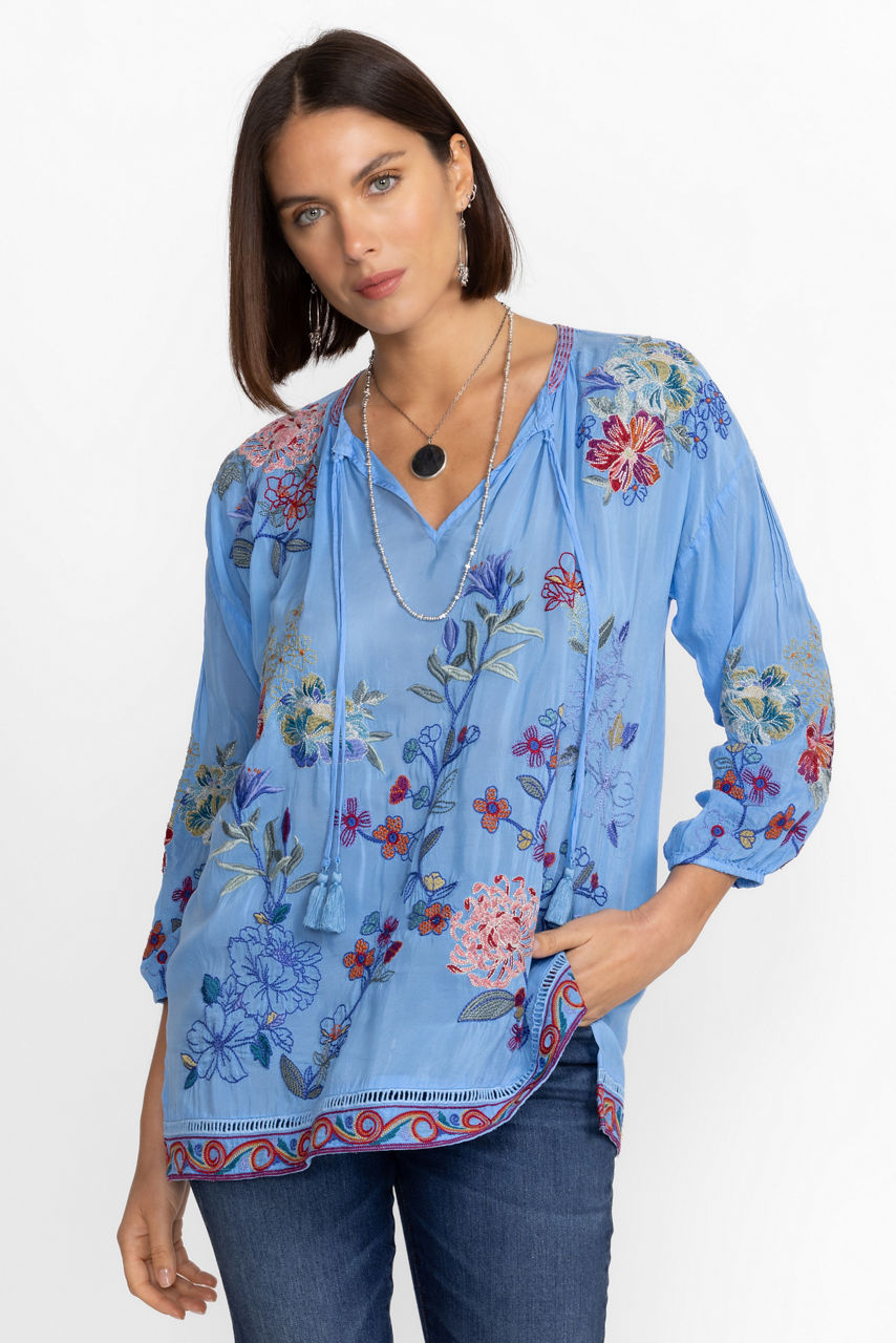 Crafted from a lightweight fabric with a hint of stretch, the Melisa Zadonia Blouse flows freely in a feminine silhouette. Featuring a split V-neck with tassels and gatherings at the neck and elasticized sleeves, this embroidered top stands out for its bold blue color and floral embellishments. Pair with white shorts for a balanced and sophisticated look.