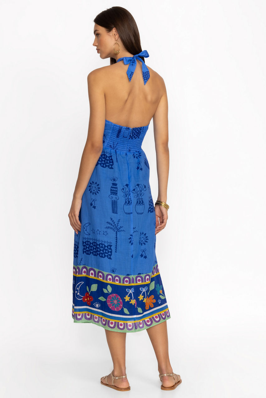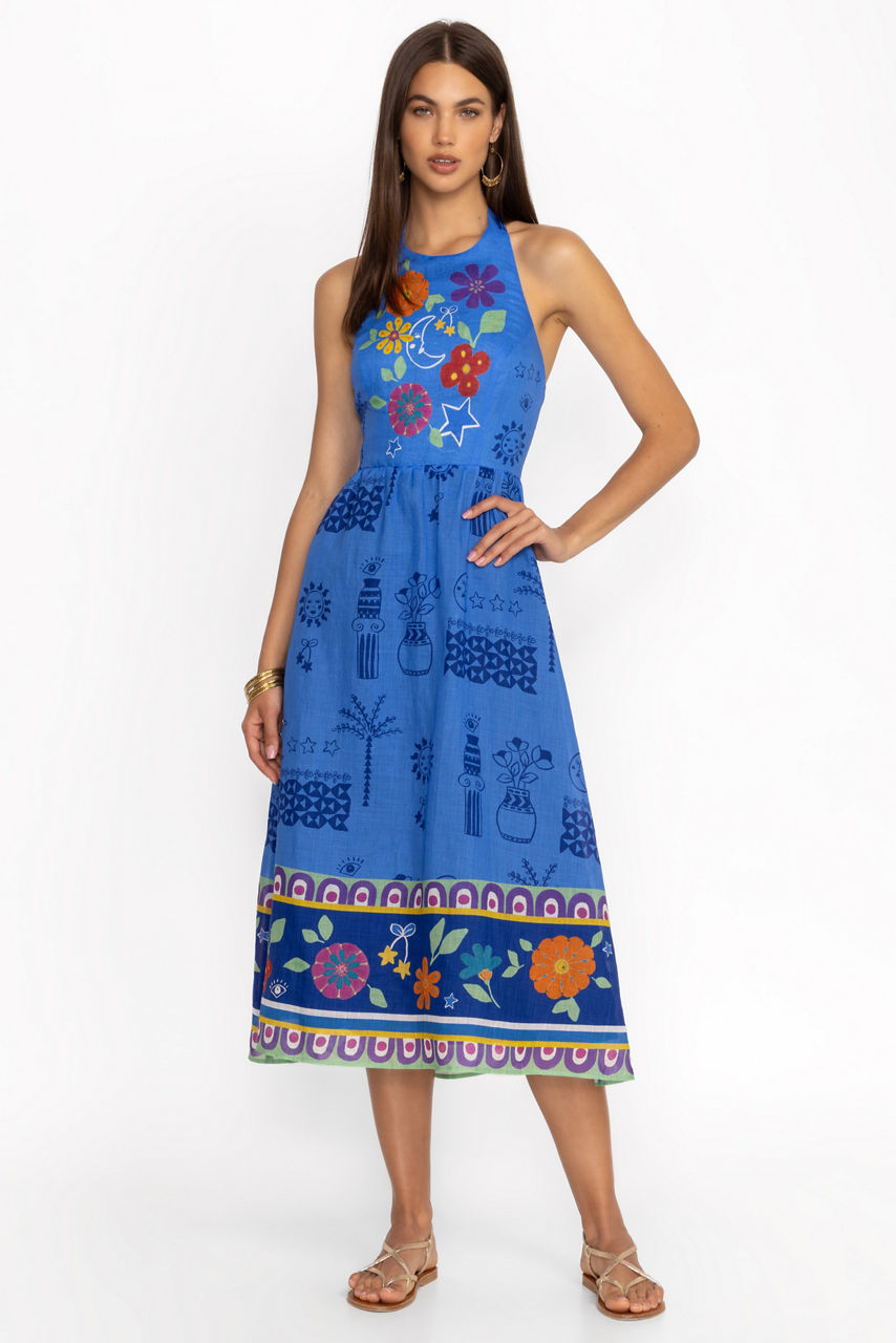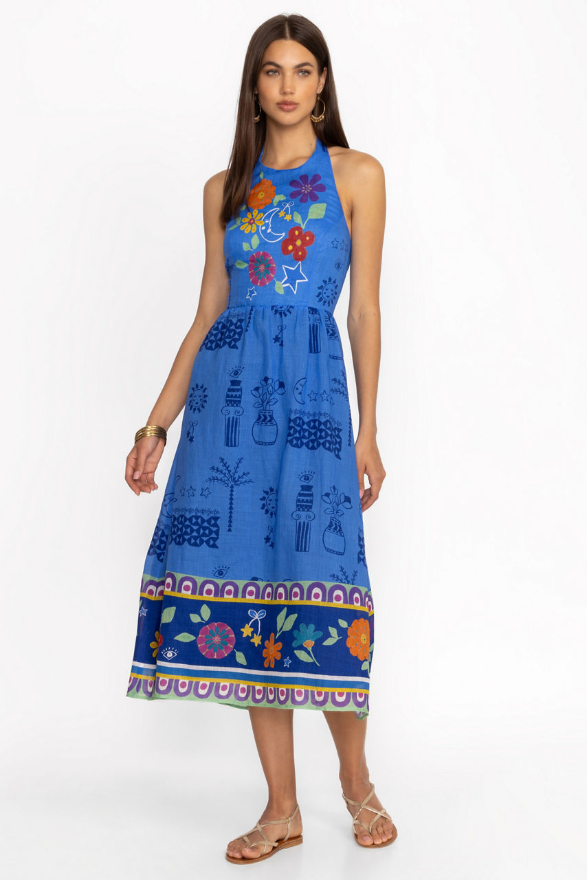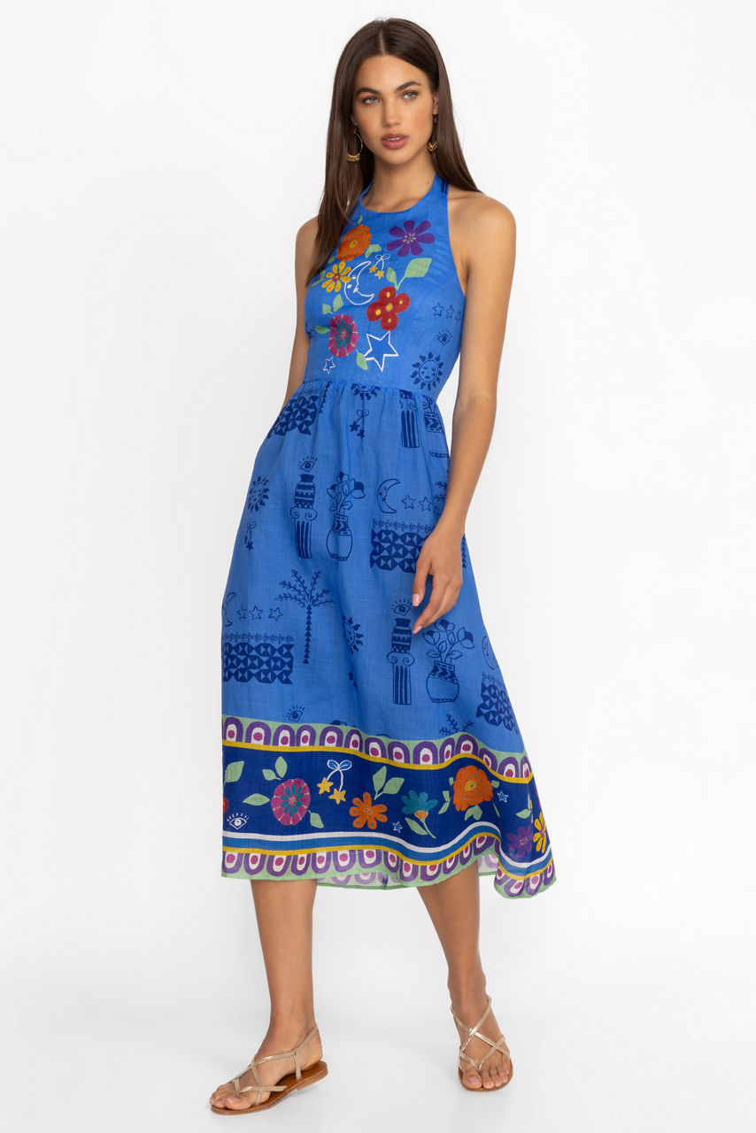 Crafted from 100% linen, the Zahar Tea Length Dress, is a bold expression of color and pattern. Featuring an intricately embroidered halter neckline with a tie at the back, this dress is finished with a princess seam detailed bodice and a lined, gathered skirt. Pair with relaxed sandals and a wide-brim sun hat for a style that channels ultimate summer freedom.