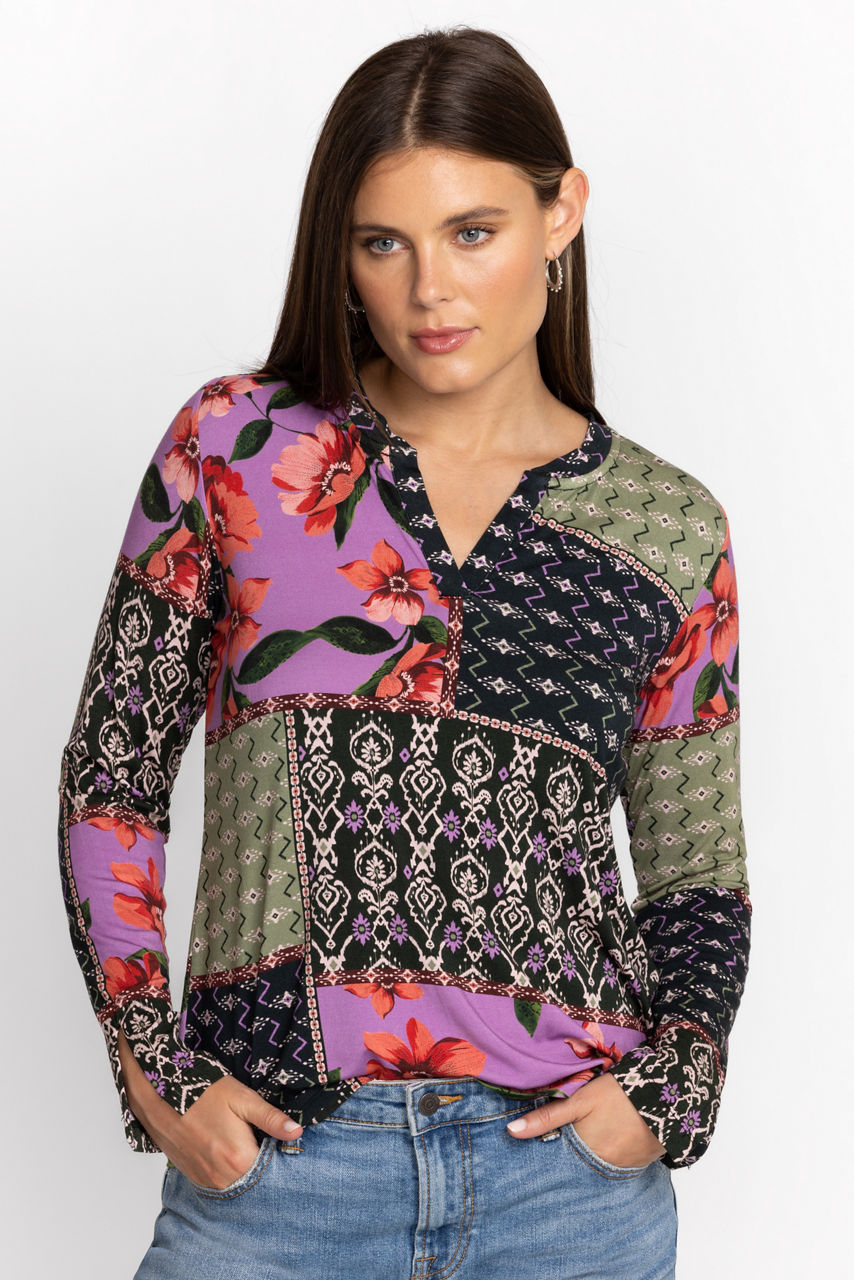 Crafted from a smooth material with a touch of stretch for comfort, the Zanda Split Neck Top taps into this season's patchwork trend. A joyful mix of color and pattern, this top features a split neck, long sleeves, and a mix of clashing yet eye-catching floral prints and patterns. Style this top with black linen or wide leg pants for an eclectic yet nonchalant daytime ensemble.