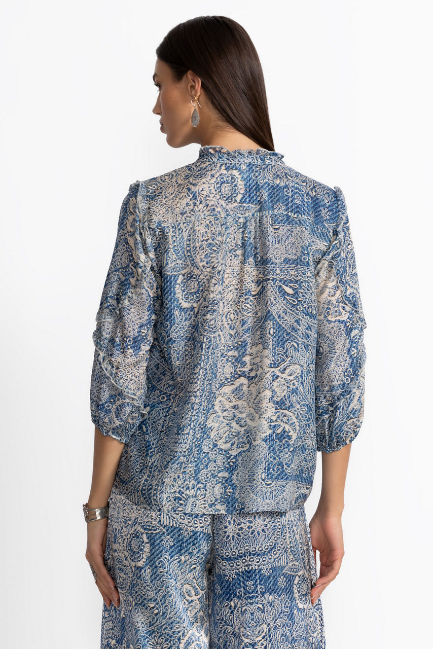 The Zeeland Blouse is crafted from 100% luxurious silk and is embellished with a denim-inspired print in hues of blue. Designed with a banded collar and elastic sleeve cuffs, this unique top is finished with intricate pintuck and gathered detailing and on the bodice and ruffles at the sleeves. Pair with dark wash skinny jeans and fashion sneakers for a posh casual look.