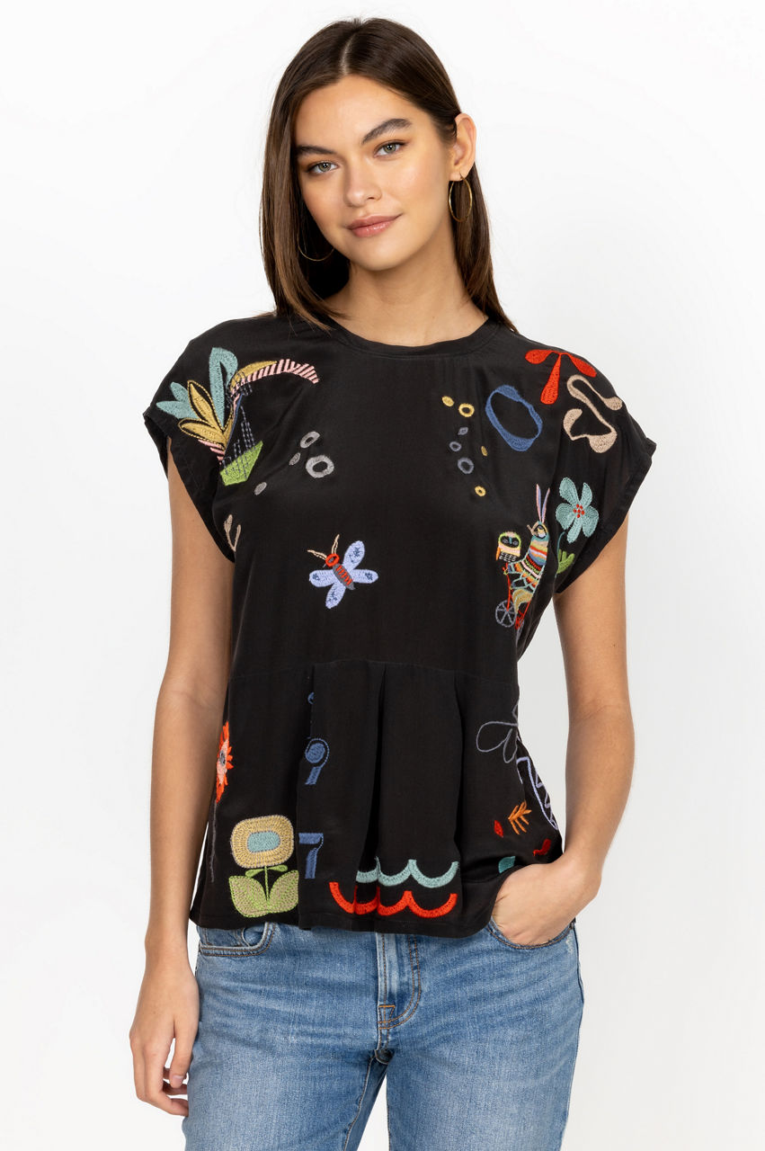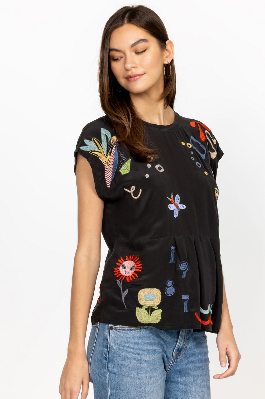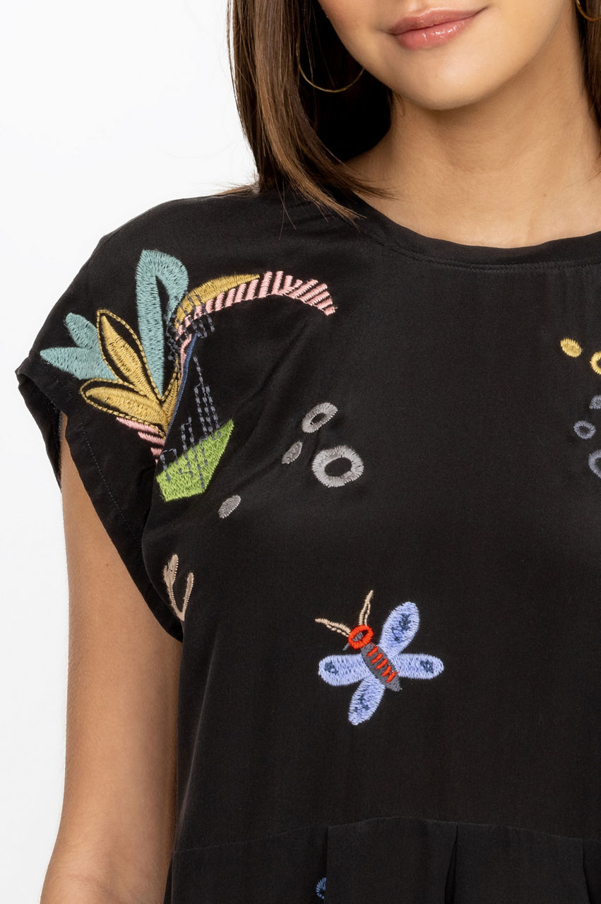 Whimsical with quality, the Zelia Blouse adds a joyful touch to a day-to-day silhouette. A versatile piece for warm days, this blouse is made from smooth silk and enhanced by a colorful placement embroidery comprising floral and animal motifs. Finished with a round neck and a pleated front, this blouse can be paired with jeans for a casual take on daytime dressing.