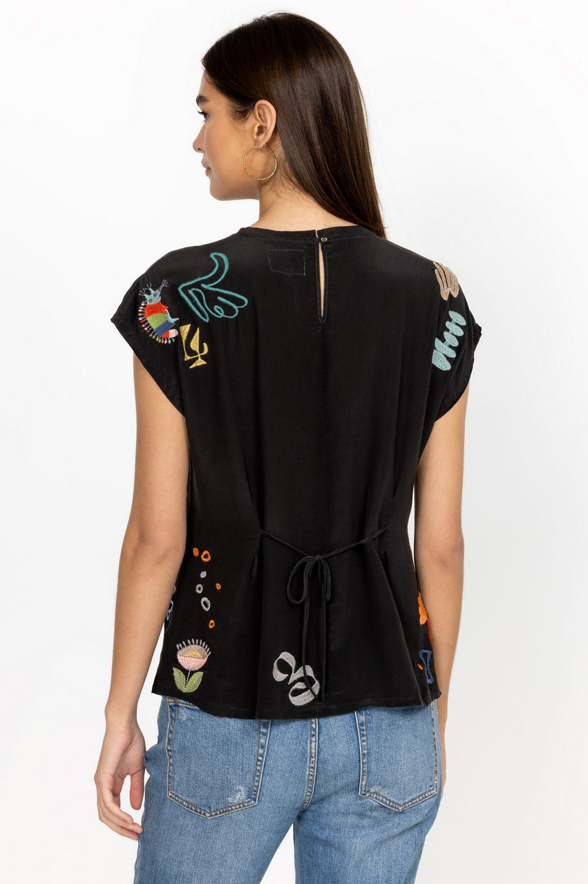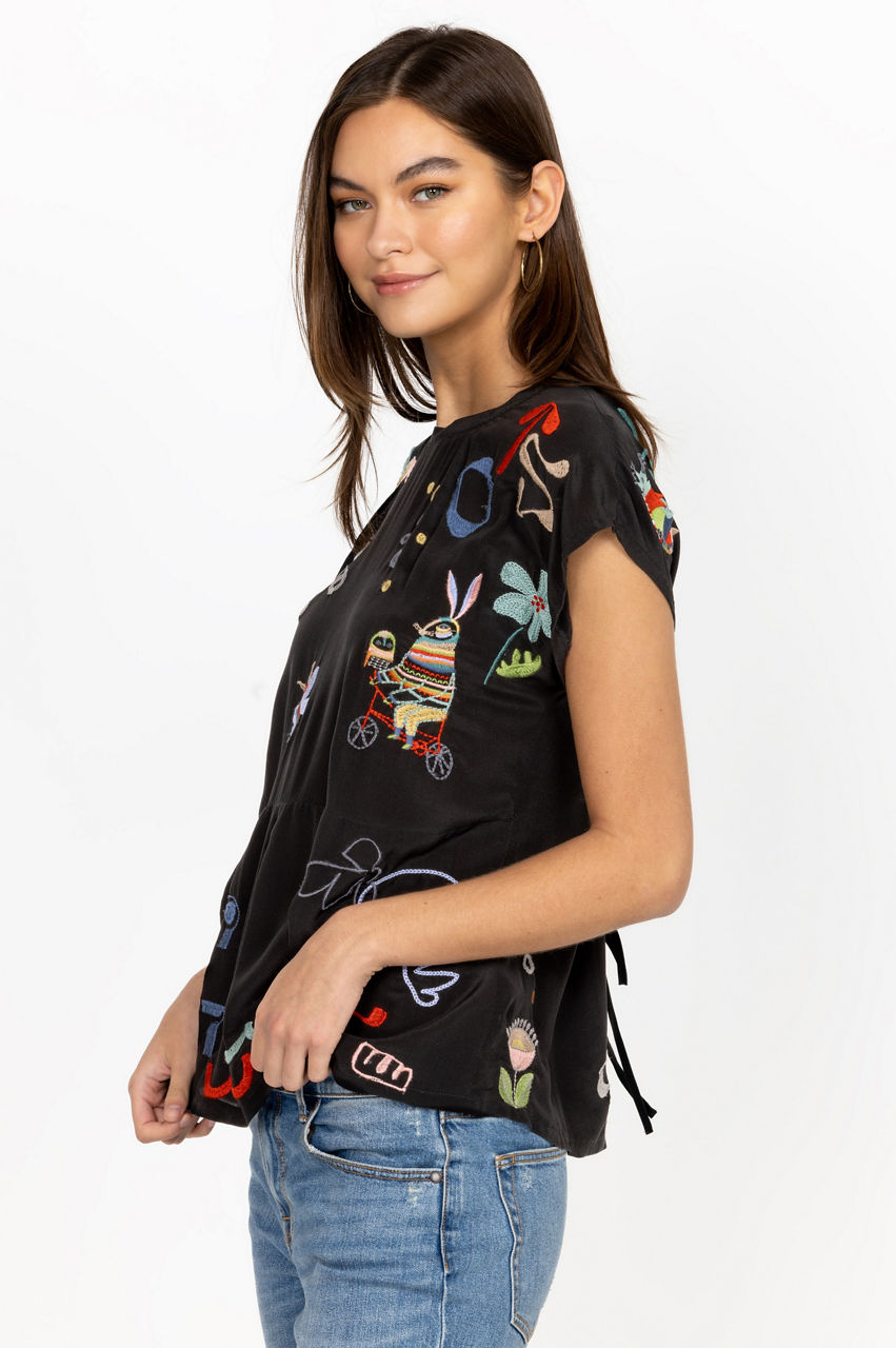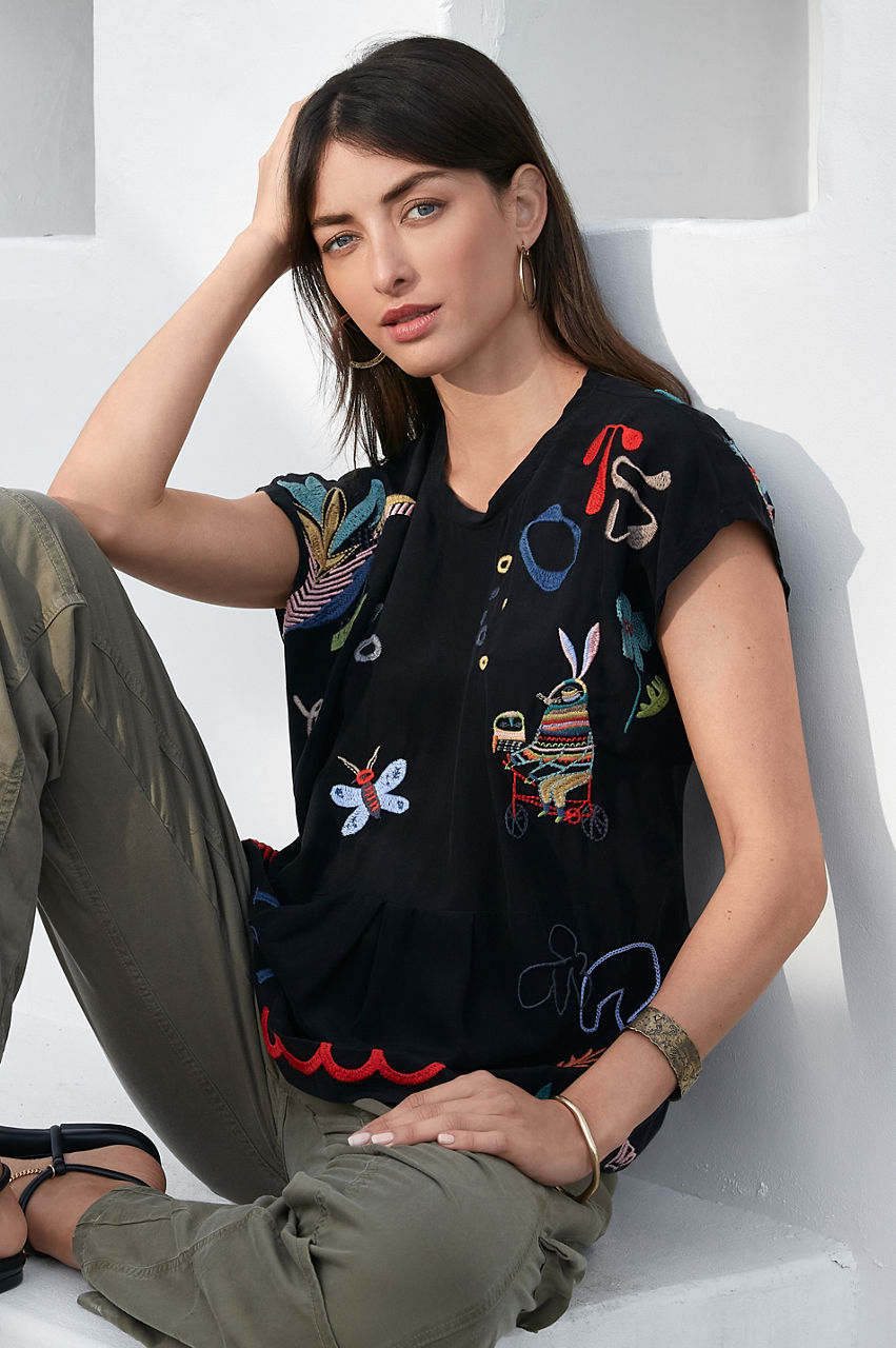 Whimsical with quality, the Zelia Blouse adds a joyful touch to a day-to-day silhouette. A versatile piece for warm days, this blouse is made from smooth silk and enhanced by a colorful placement embroidery comprising floral and animal motifs. Finished with a round neck and a pleated front, this blouse can be paired with jeans for a casual take on daytime dressing.