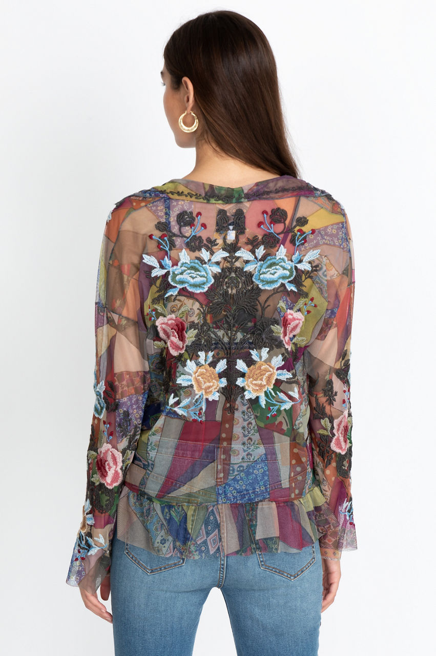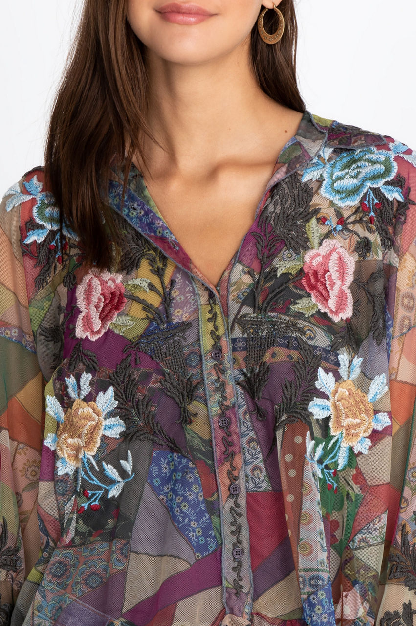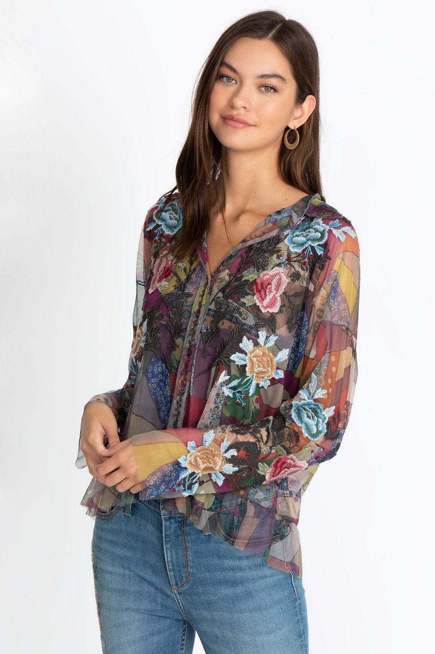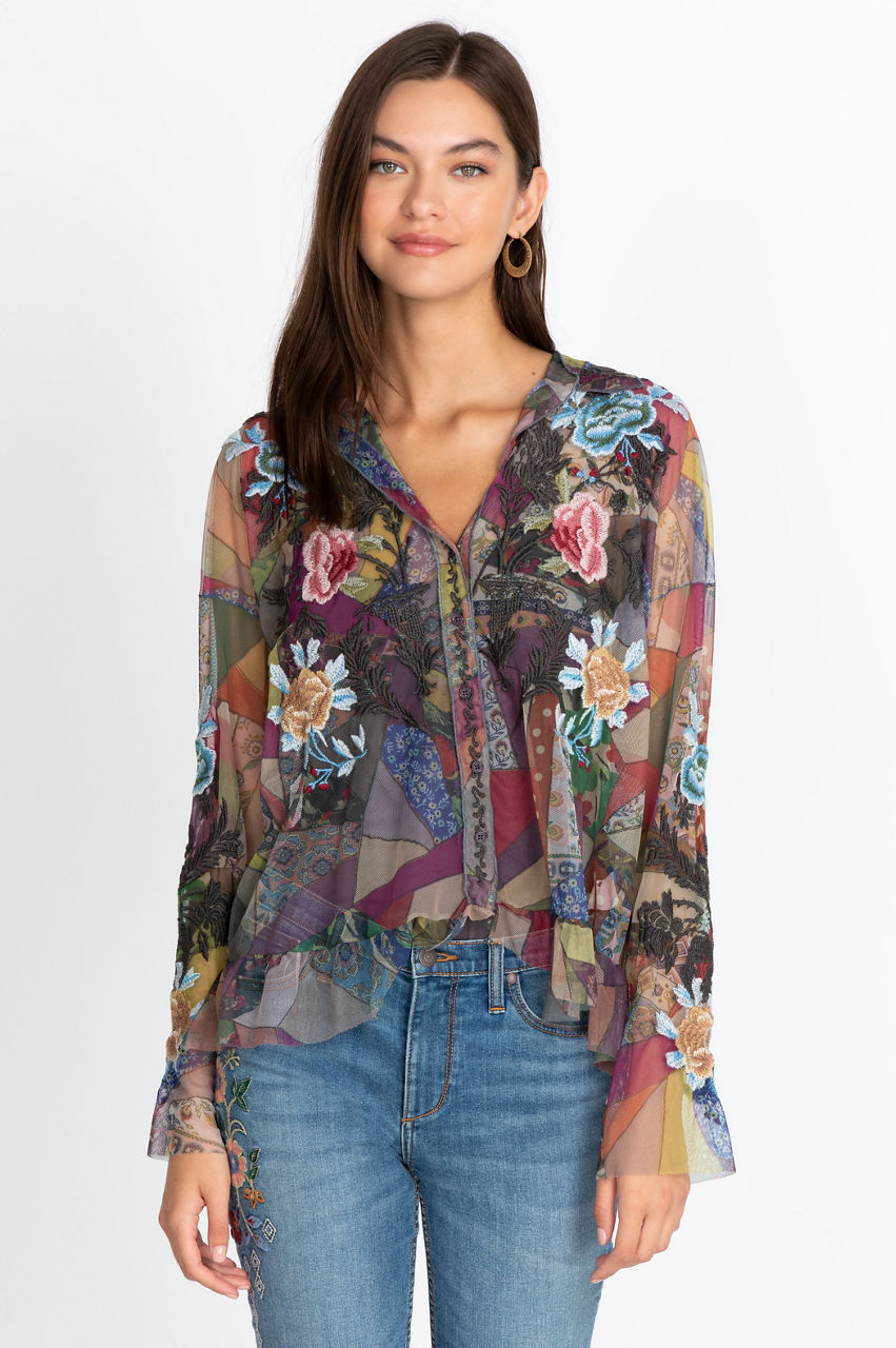 The multi-colored Zell Mesh blouse comes embellished with intricate embroidery that comes with singular Johnny Was designs that make it a unique addition to any woman s wardrobe. It also has a separate knit slip and a button front for a classic look that comes with premium quality and understated elegance.