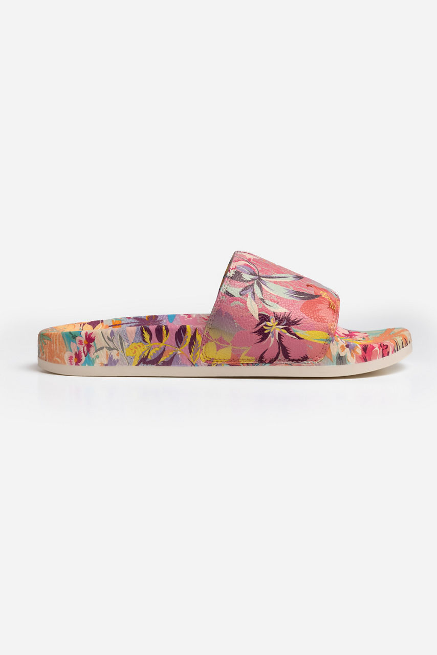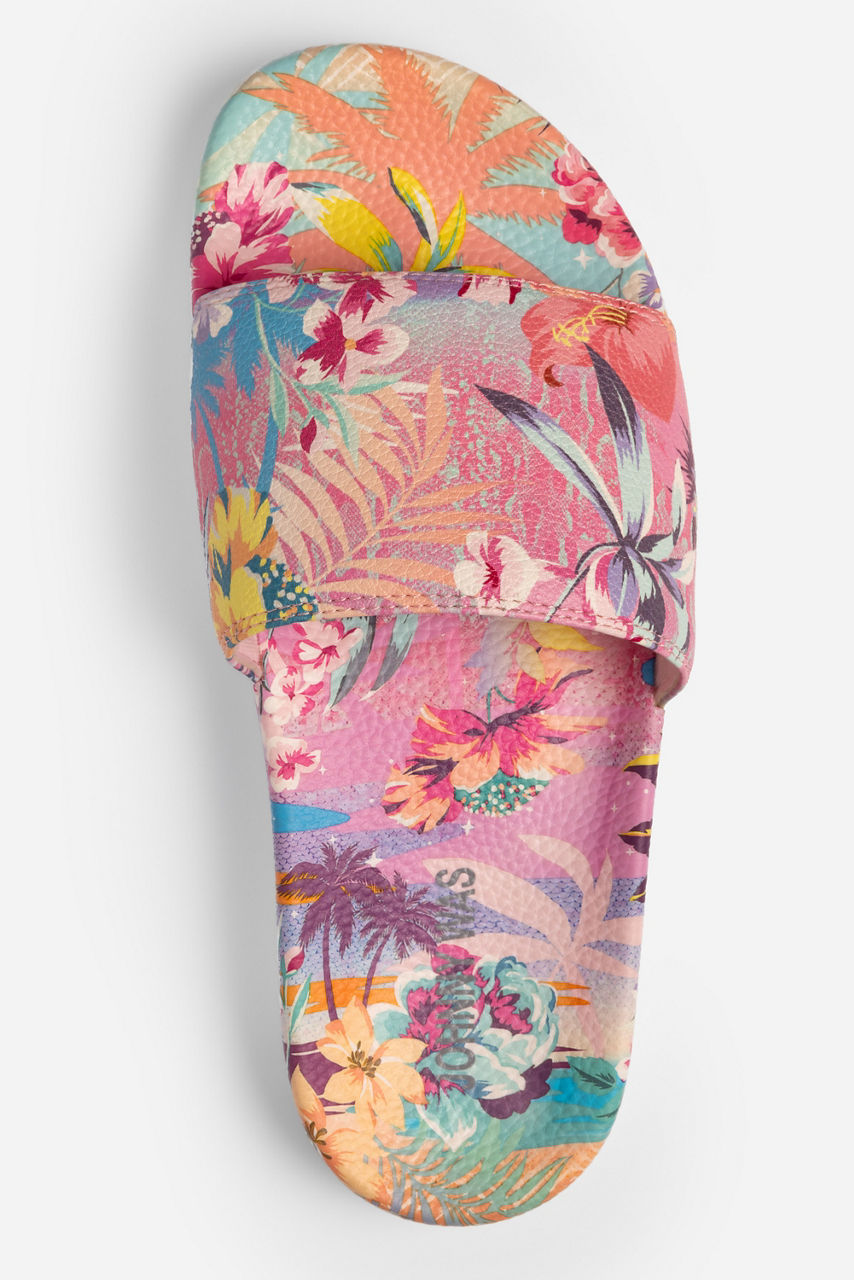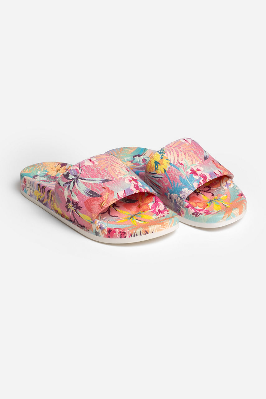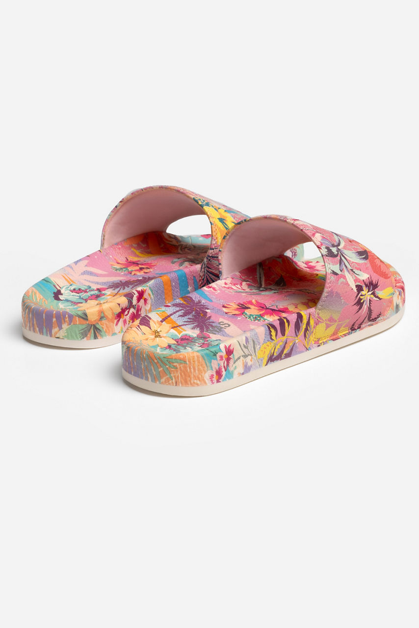 Embellished with vibrant color and a fresh floral pattern, the Zeru Pool Slides are essential to any vacation packing list. Thoughtfully crafted with a comfortable molded platform footbed, these easy slides are finished with a wide strap across the top. Wear them with the Zeru Tie Neck Maxi Kaftan and the Marilyn Ruched One Piece for a perfectly coordinated poolside look.