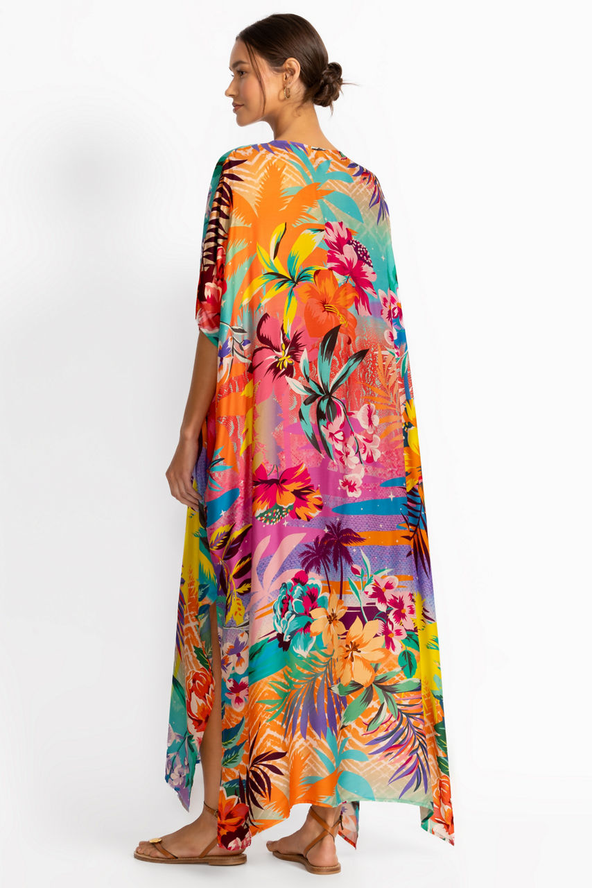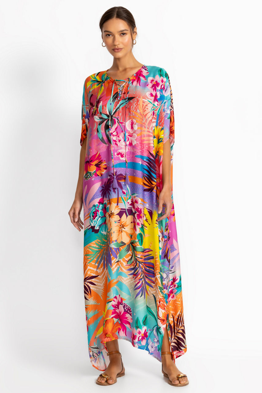 Step into island vibes with the Zeru Tie Neck Maxi Kaftan, adorned in a vibrant tropical palm pattern that captures the essence of paradise. Designed with a relaxed silhouette and adjustable tie-neck detail, it’s the perfect blend of comfort and bold beachside style.