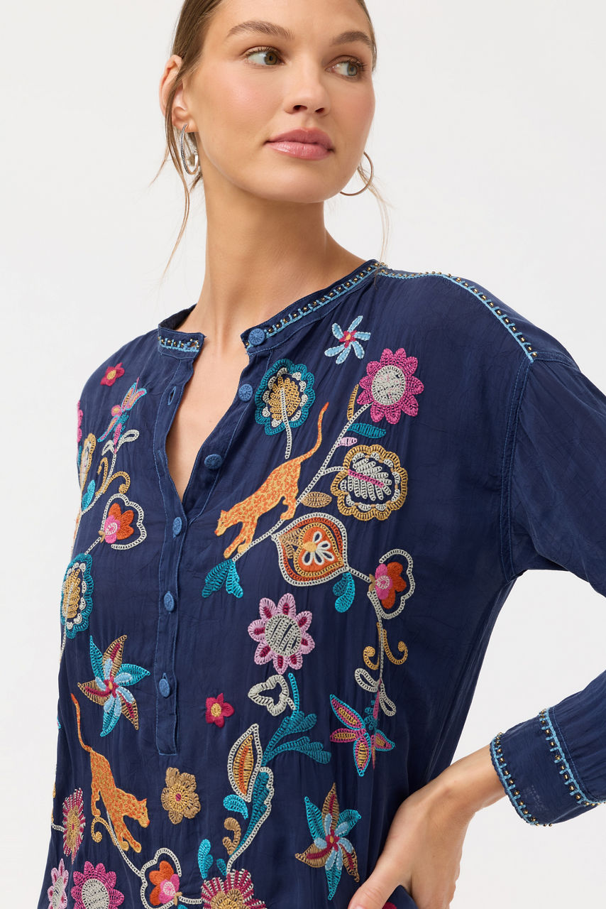 The Maxima Zinnia Tunic showcases intricate floral embroidery that adds texture to its relaxed silhouette. Designed with a curved hemline, roll-tab sleeves, and a partial button closure, it blends comfort with thoughtful detailing. Style it with slim trousers for polished ease or layer over leggings for a laid-back weekend look.