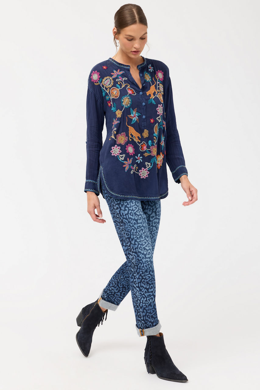 The Maxima Zinnia Tunic showcases intricate floral embroidery that adds texture to its relaxed silhouette. Designed with a curved hemline, roll-tab sleeves, and a partial button closure, it blends comfort with thoughtful detailing. Style it with slim trousers for polished ease or layer over leggings for a laid-back weekend look.