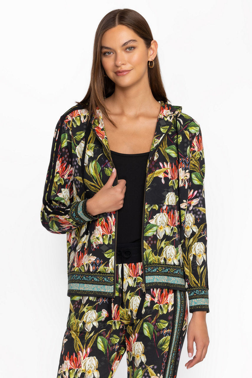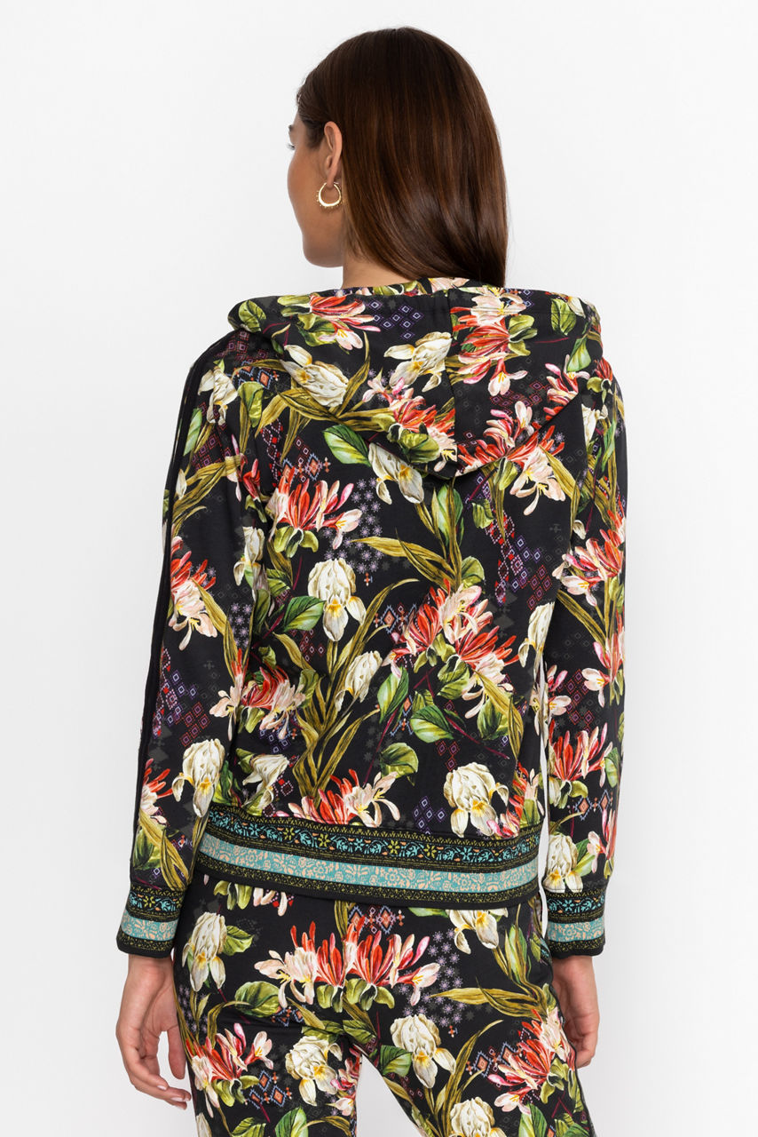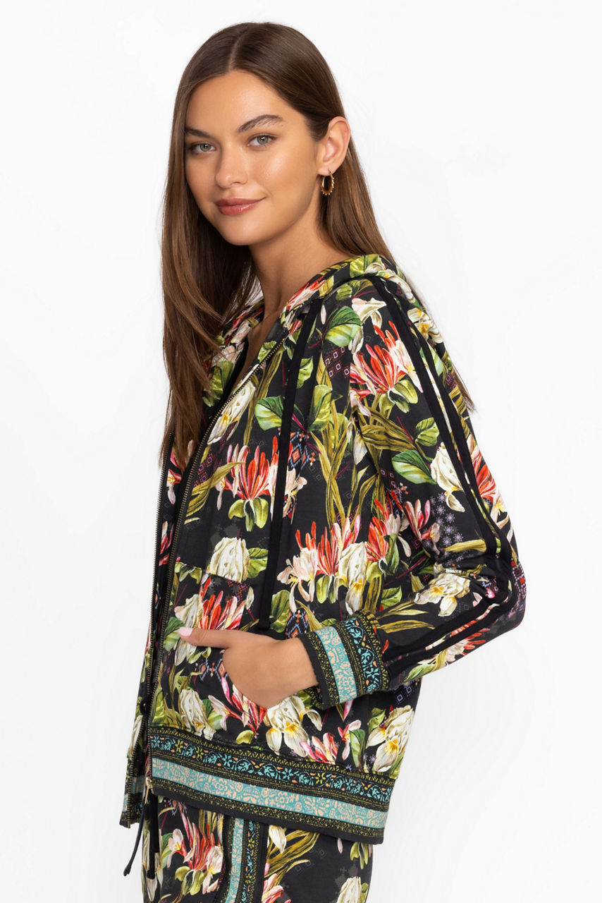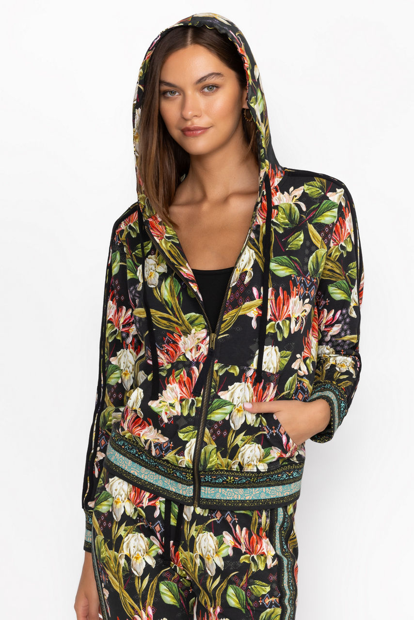 Brilliantly embellished with a vibrant floral pattern, the Zip Front Hoodie with Tape is the perfect blend of cozy comfort and athletic styling. Featuring a zipper-front with an attached hood, this jacket is accented with athletic striping at the cuffs and hemline and is finished with a kangaroo pouch. Pair with coordinating leggings and a fitted athletic top for an elevated gym look.