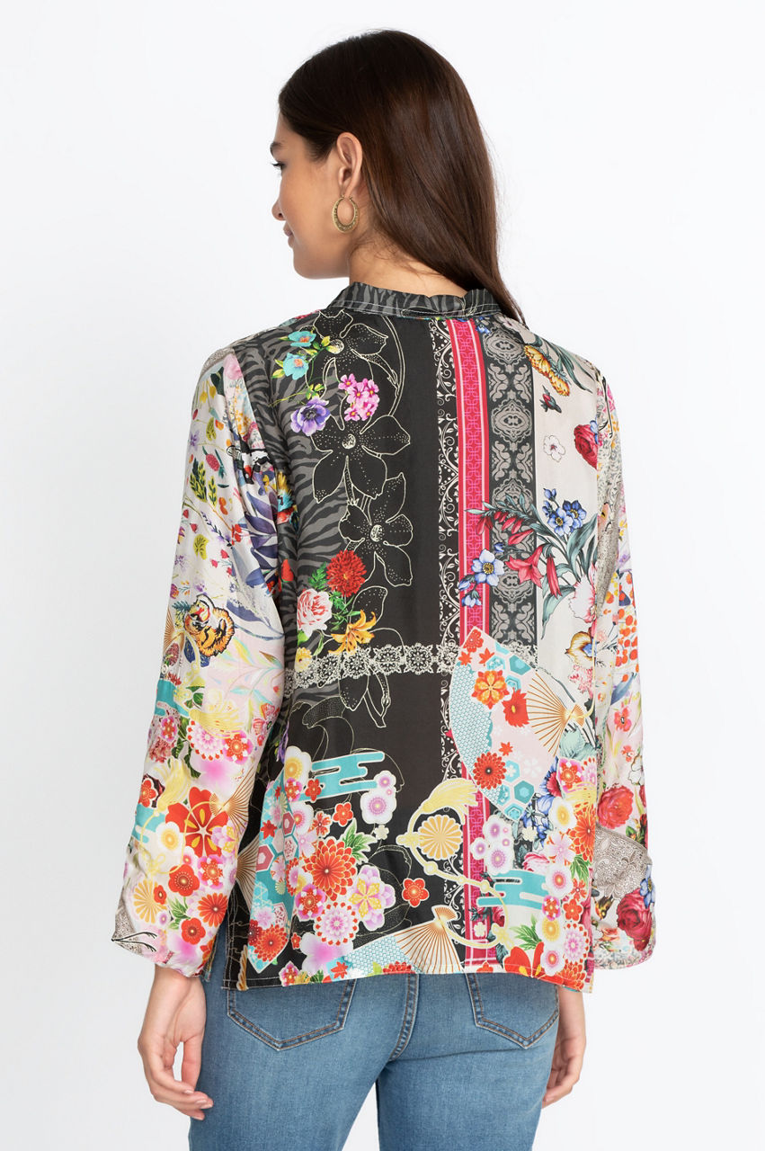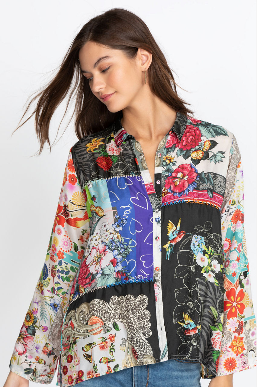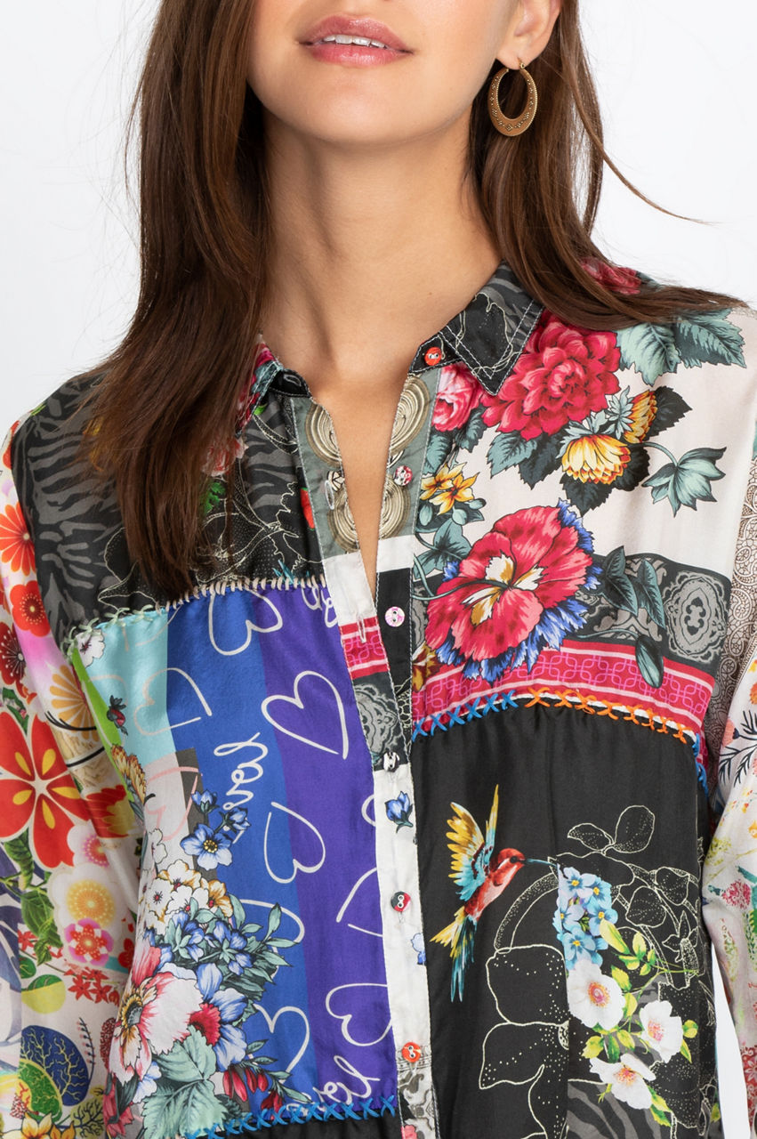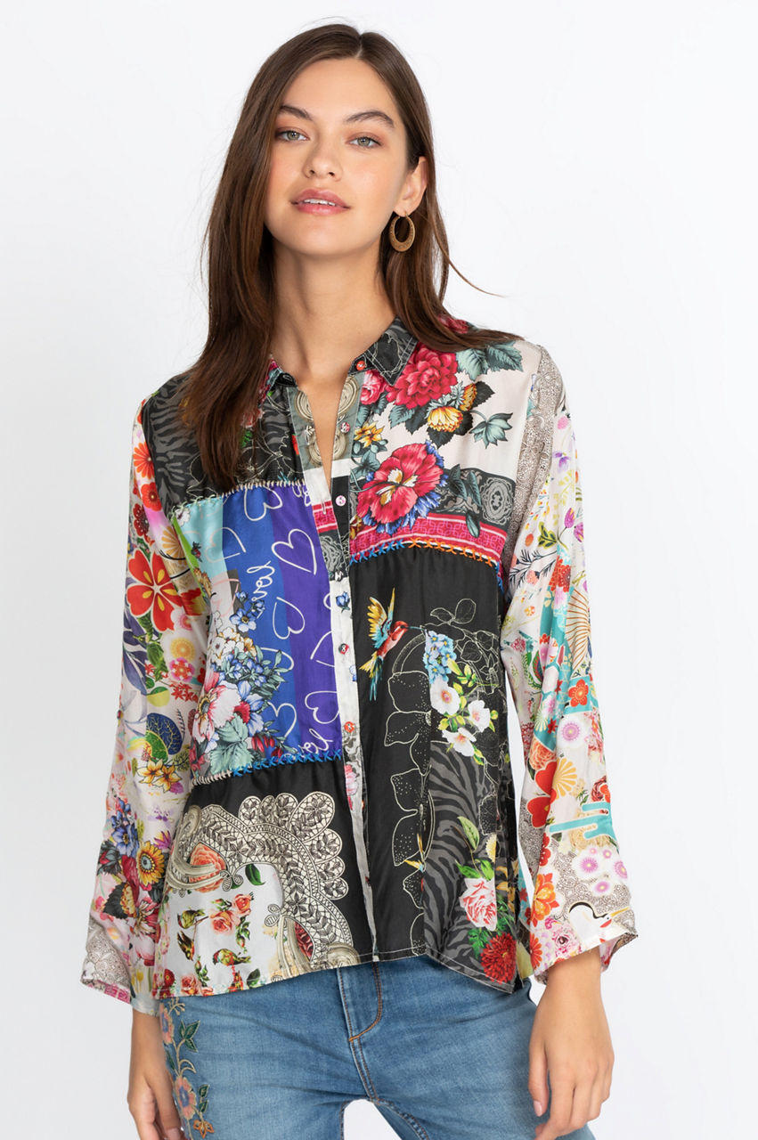 Made from 100% silk, our Zippy Julia Button up combines both style and comfort. This stunning piece features an impeccable artisan-inspired pattern and a brilliant design to give you a new go-to top this season. Pair this piece with your favorite cargo pants and stylish flats or with denim shorts and strapped Bohemian sandals.
