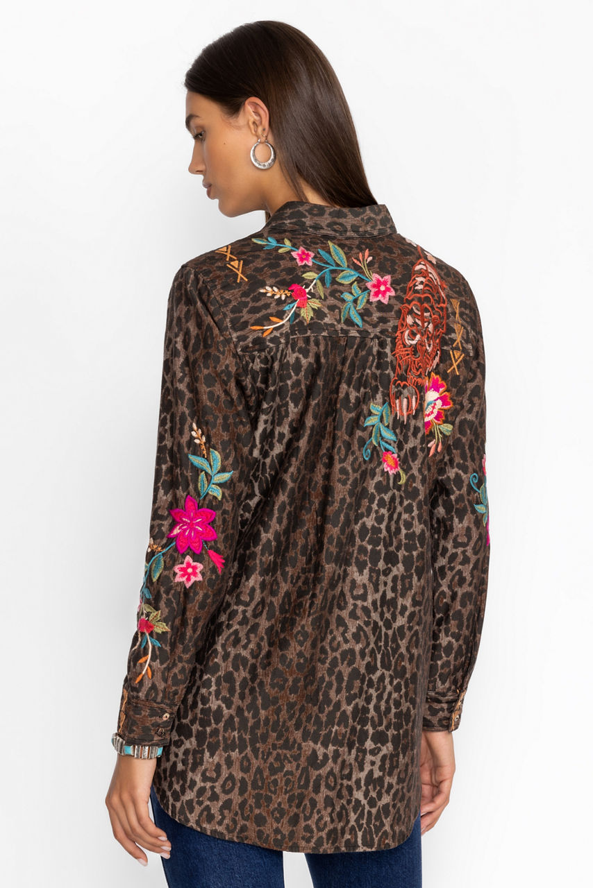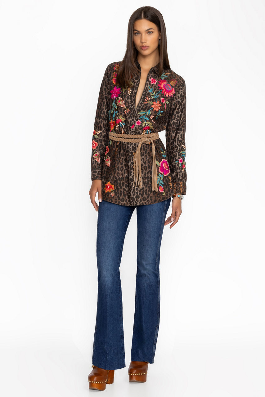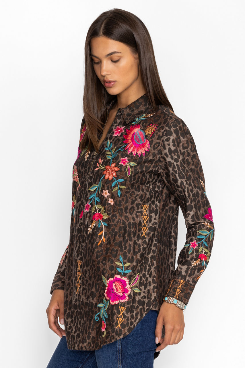 Crafted from 100% breathable cotton, the Nylah Zip Up Shirt Tunic boasts an eye-catching animal print and is embellished with bold floral embroidered detailing. Featuring a collared partial zip front, this tunic-length top is finished with a shirttail hemline. Pair with black leggings and leather flats for an elevated casual look.