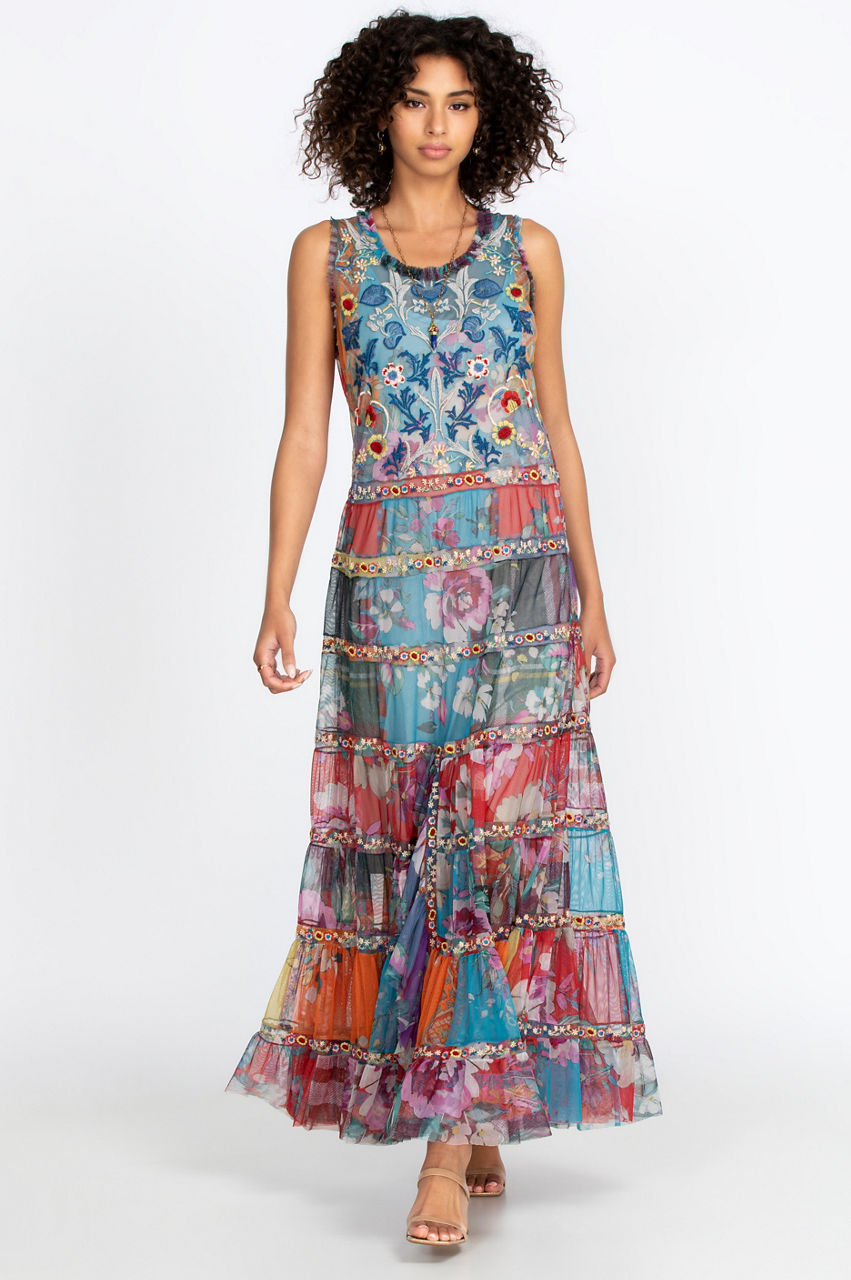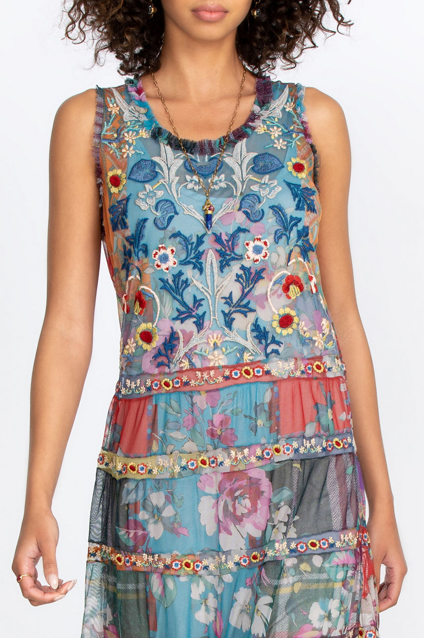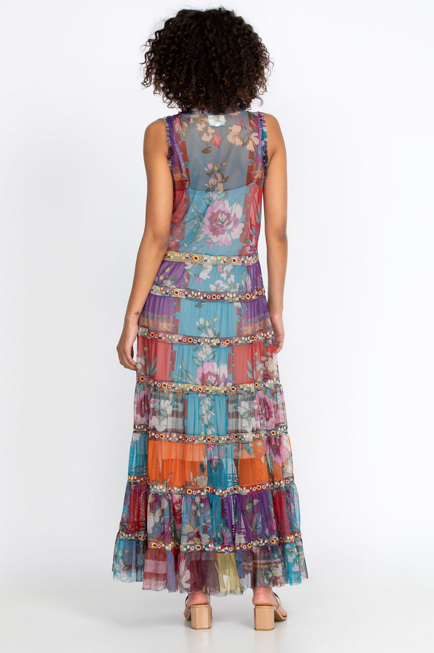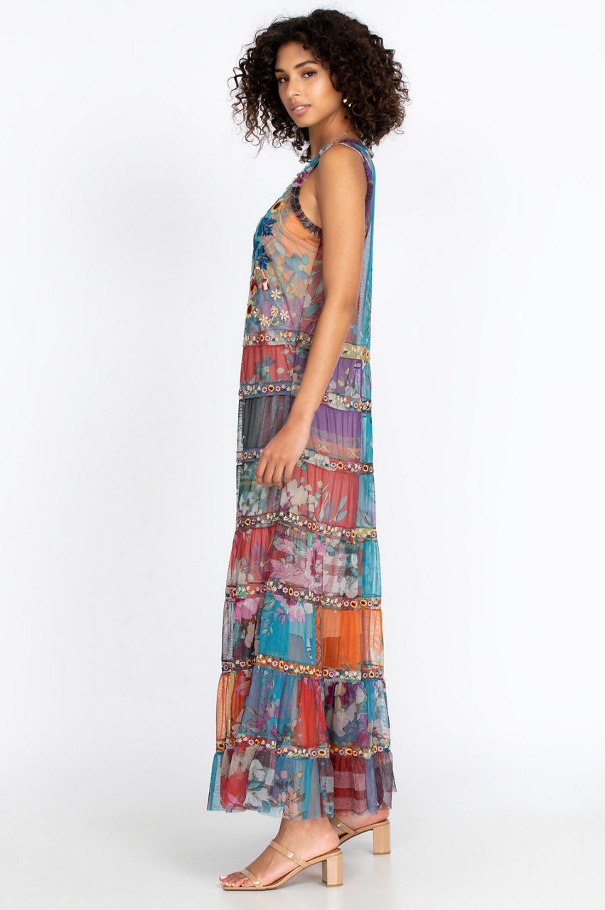 The Zoie Mesh Dress is both elegant and vibrant with its multi-colored design. This maxi dress will instantly create a bold and sophisticated look with its pattern that mixes floral elements with horizontal lines. With its tank dress design, front slit, and hem detail, this colorful dress will look exquisite with some wedges, a straw hat, and some layered jewelry for a boho-inspired look.